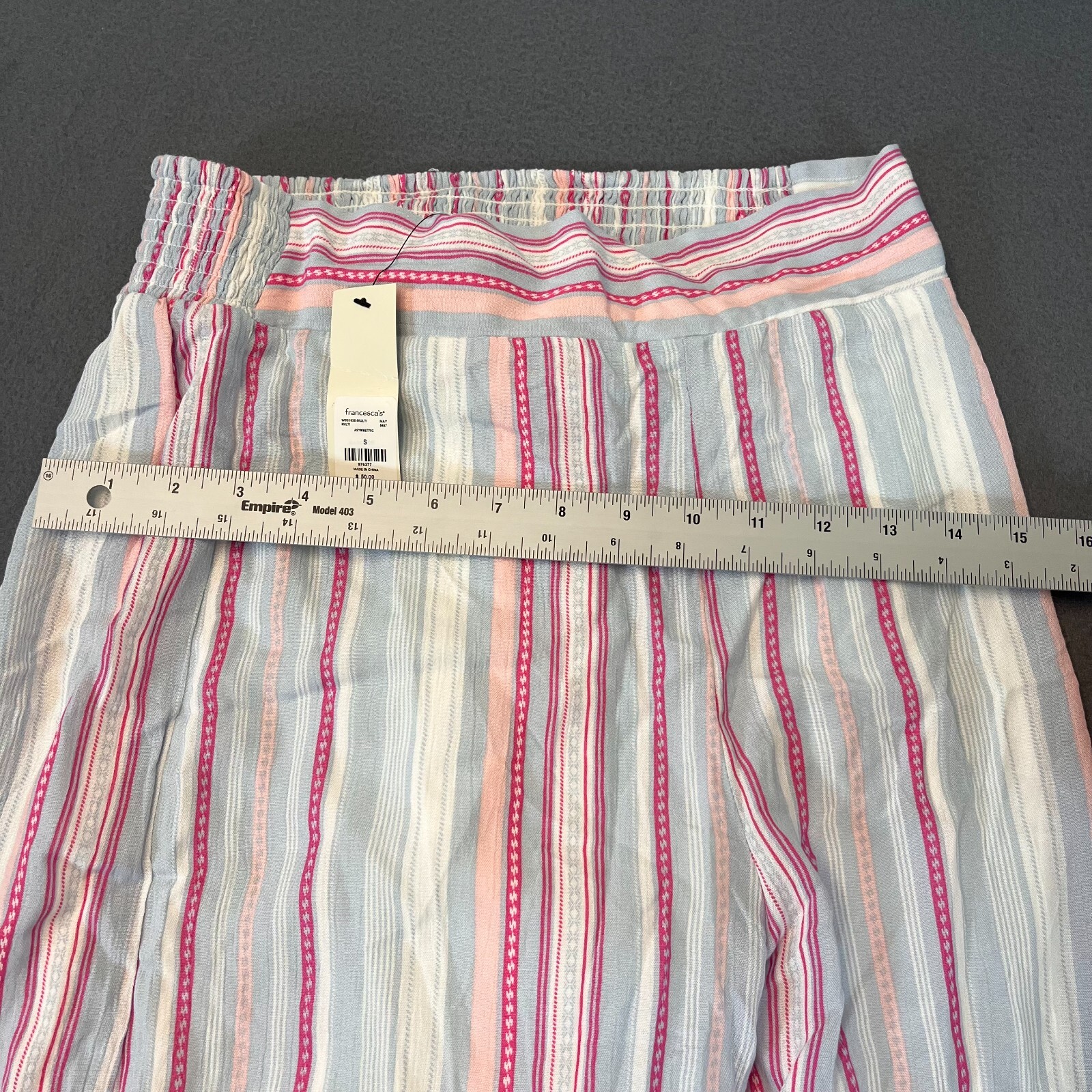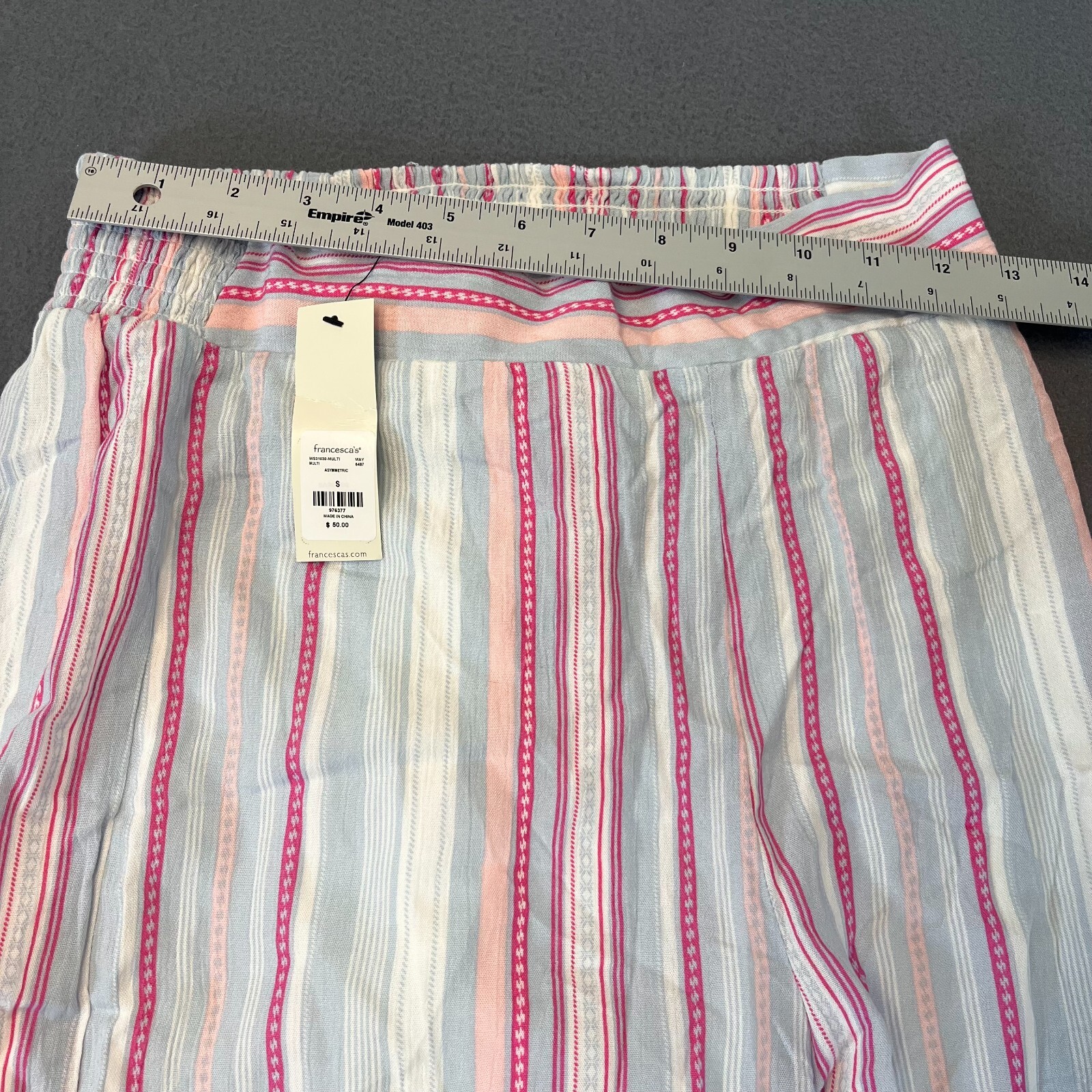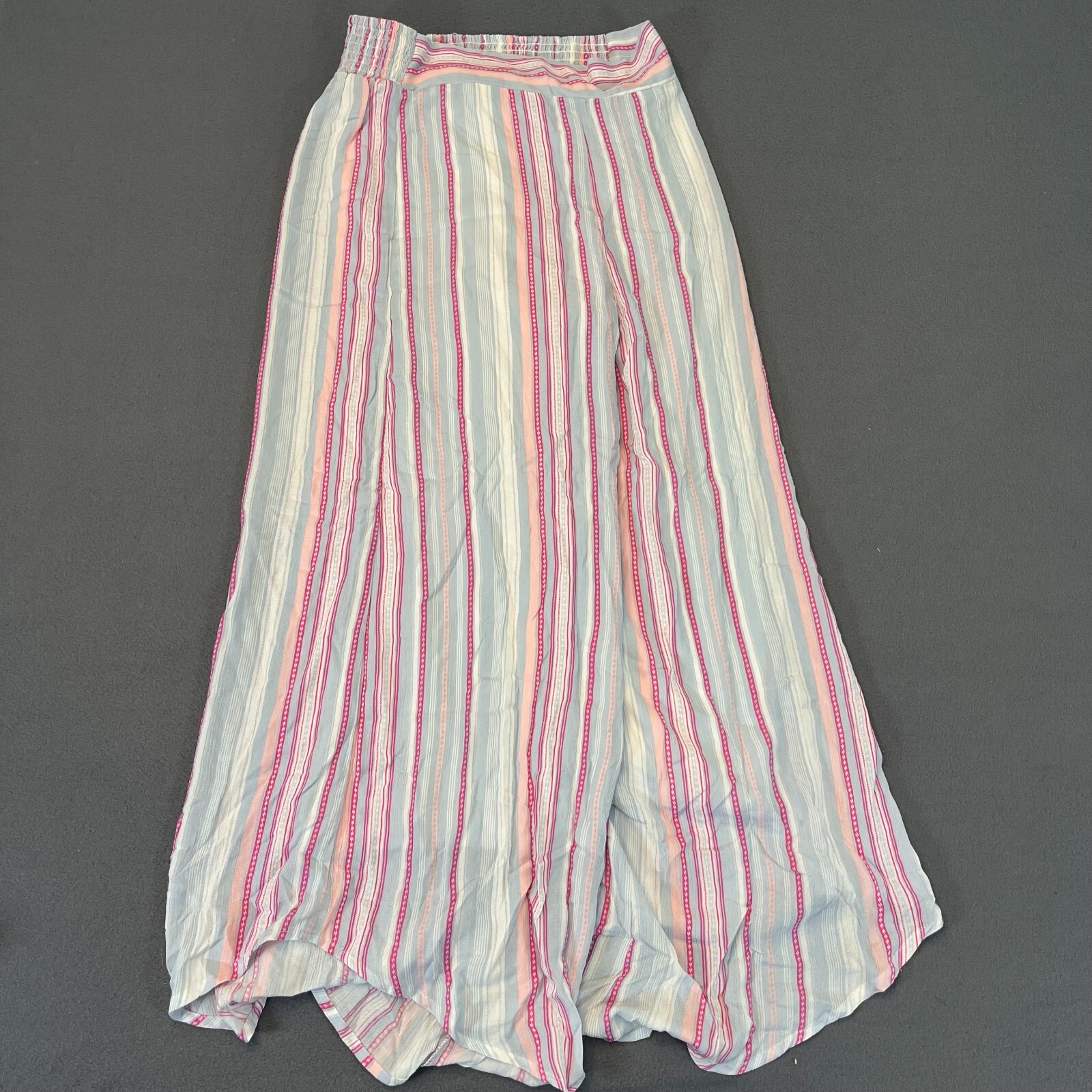 The Francesca's Callie Asymmetrical Striped Pants in size small are a stylish addition to any beach or flowy outfit. These wide-leg pants feature a pull-on closure and are made from a blend of polyester and rayon, offering comfort and a trendy harem style. The multicolor striped pattern adds a fun and eye-catching touch, making these pants perfect for a casual and on-trend look.