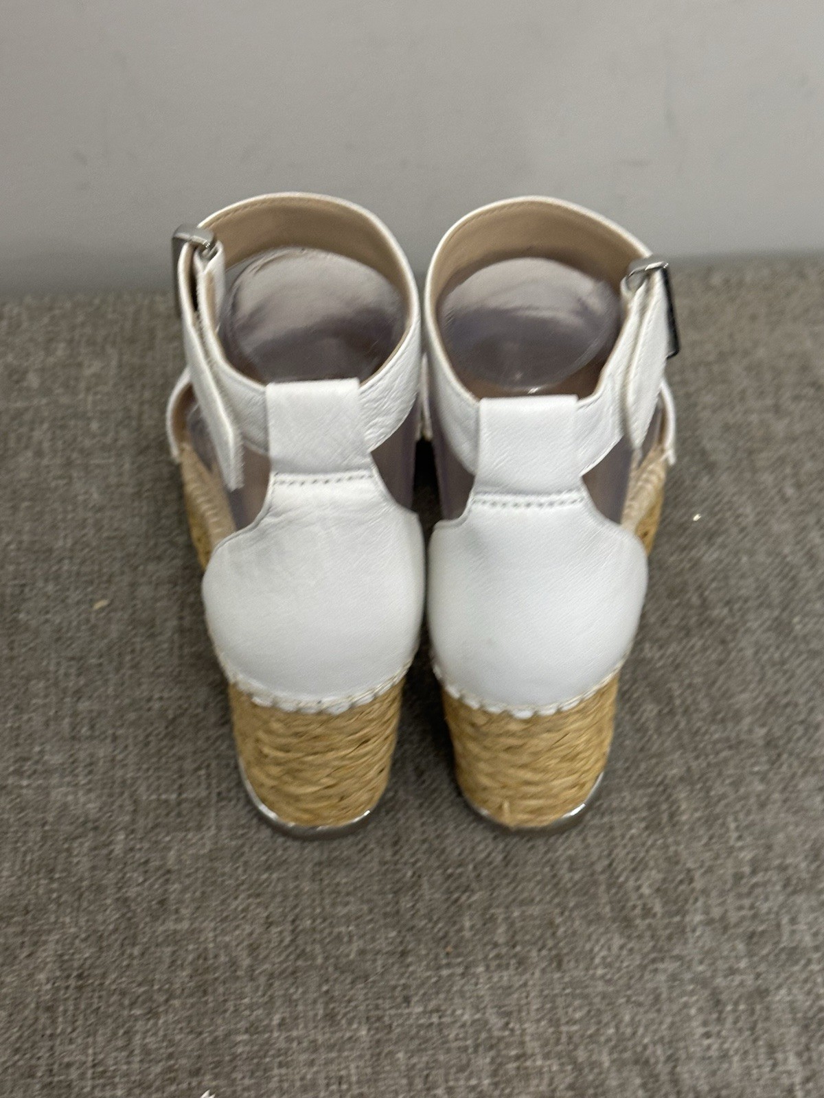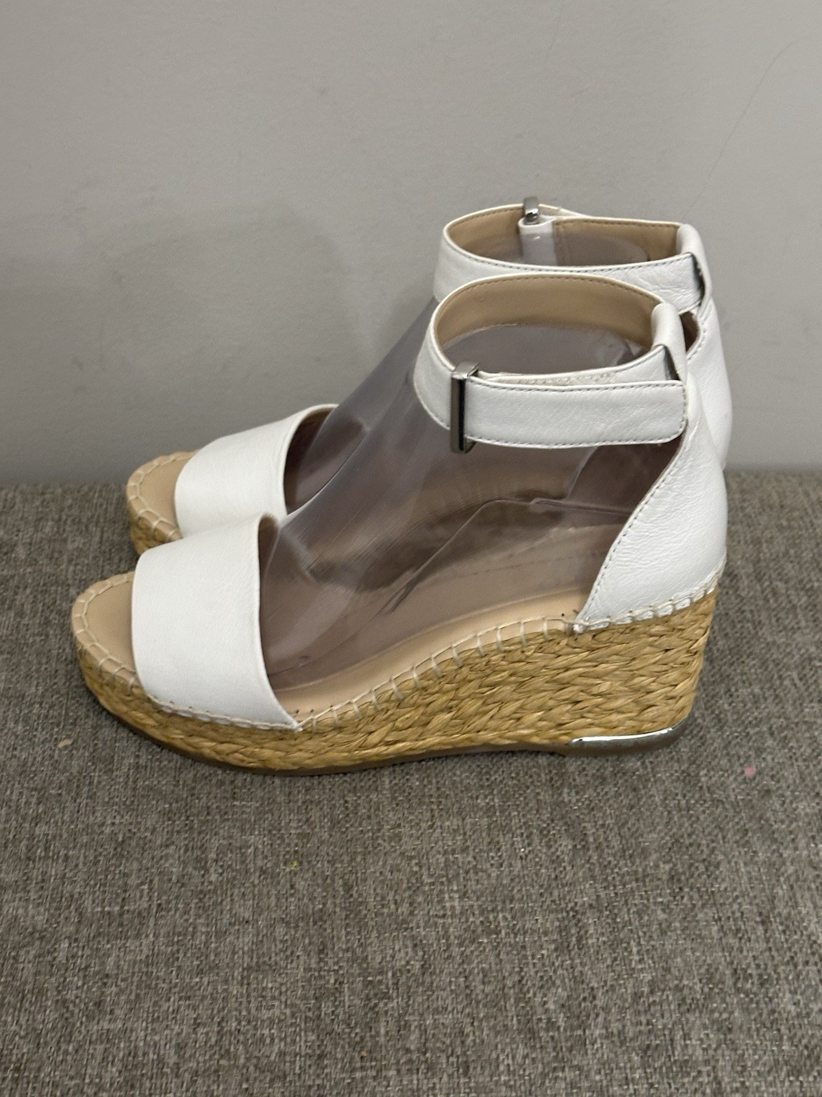 The Franco Sarto Clemens espadrille wedge sandals in white leather, Size 7.5, are a stylish choice for women looking for a comfortable and versatile sandal option. With a mid-height wedge heel and adjustable ankle strap, these sandals provide both fashion and functionality. The solid white color and logo accents add a touch of sophistication to any outfit, making them a great option for casual or dressed-up occasions. Made from high-quality leather, these sandals are durable and sure to be a staple in any woman's shoe collection. Preowned Good Condition