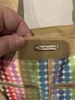 This Franco Sarto tote is a colorful and spacious handbag perfect for any woman on-the-go. With a polka dot pattern and silver hardware, this nylon tote is not only stylish but also durable. The double handles make it easy to carry, while the zip and snap closure keep your items secure. The interior is lined with purple nylon and includes inner pockets, an outside zip pocket, and even a mini umbrella for added convenience. The bag is large in size and features a black seatbelt strap handle. The colorful theme of the bag makes it a great addition to any outfit.