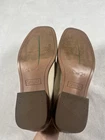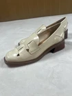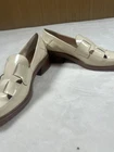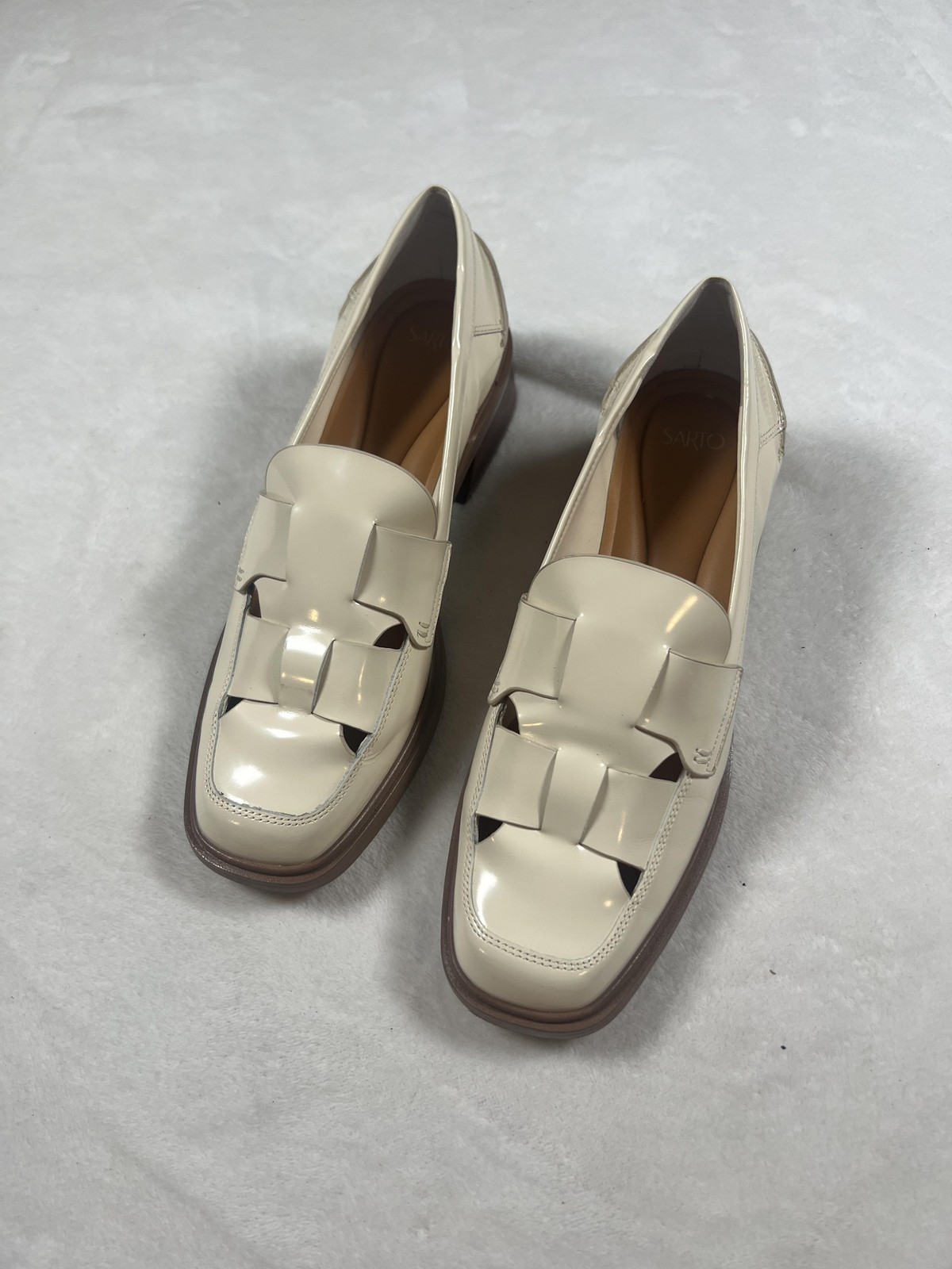 Brand: Franco Sarto (SARTO line) Style: Womens slip-on loafer shoes with a square toe and low block heel. Color: White leather upper with brown stacked-look sole and heel; solid pattern. Materials: Leather upper; synthetic lining, insole, and outsole. Size: Womens US 9M; UK 6.5; EU 40; AU 9 (per inner size tag). Details: Cutout woven strap detail across vamp, cushioned footbed, smooth glossy finish, SARTO logo on insole and outsole with 1990 crest graphic, classic slip-on design suitable for dressy or office wear.