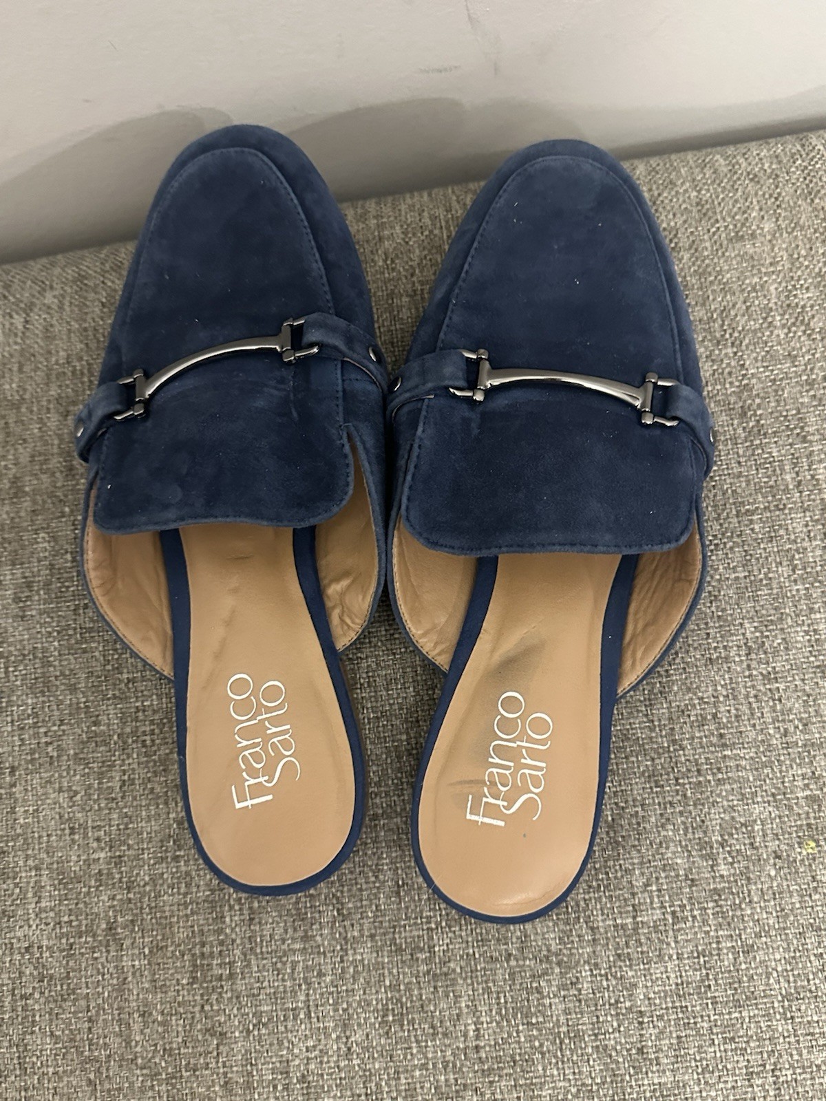 These Franco Sarto Women’s Blue Suede Mule Loafers in Size 7.5 are a stylish and versatile addition to any woman's shoe collection. With a comfortable flat design, faux leather lining, and rubber outsole, these loafers are perfect for travel, casual outings, or business meetings. The blue suede upper material adds a touch of sophistication, and the mule style offers a trendy and effortless look. Whether you're heading to the city or the office, these loafers provide both comfort and style for a chic wardrobe staple. Preowned Good condition