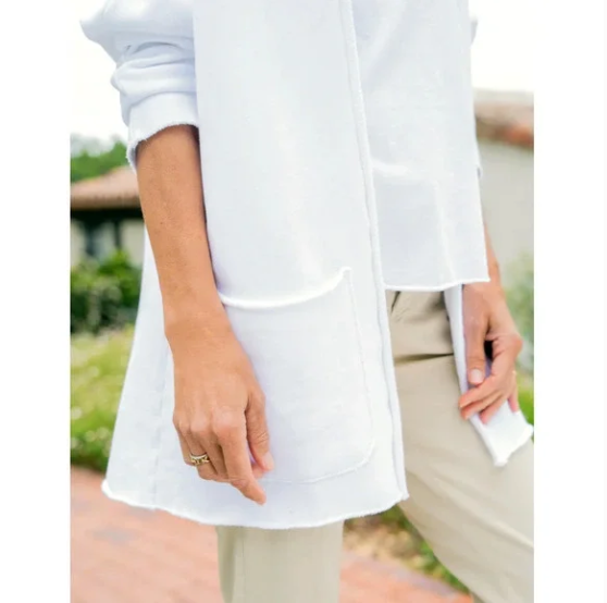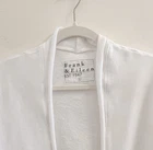 A buttonless, oversized silhouette means slipping this soft, unstructured cardigan over anything is a sea breeze. Our signature raw edge hem adds a hint of contemporary cool, while extra roomy pockets mean leaving your purse at home isn't a problem. Frank & Eileen Cardigan Size Large Color White Style Barbara Hand Cut Raw Hem and Cuffs Buttonless Open Front Patch Pockets Fits True to Size Triple Fleece, 100% Cotton Excellent Condition *(A couple of faint spots on front, barely noticeable - see photo) Approximate (flat) Measurements : Armpit - Armpit - 27" Length - 30" Sleeve Length - 24" Tags : Classic, Casual, Beach, Cruise, Coastal, Mountain, Nautical, Vacation, Travel, Leisure, Comfortable, Spring, Summer, Fall, Winter, Layers, Lightweight, Outerwear, Jacket, Sweater, Knit, Coastal Grandmother, Quiet Luxury, Old Money, Transitional, Natural, Neutral, Minimal