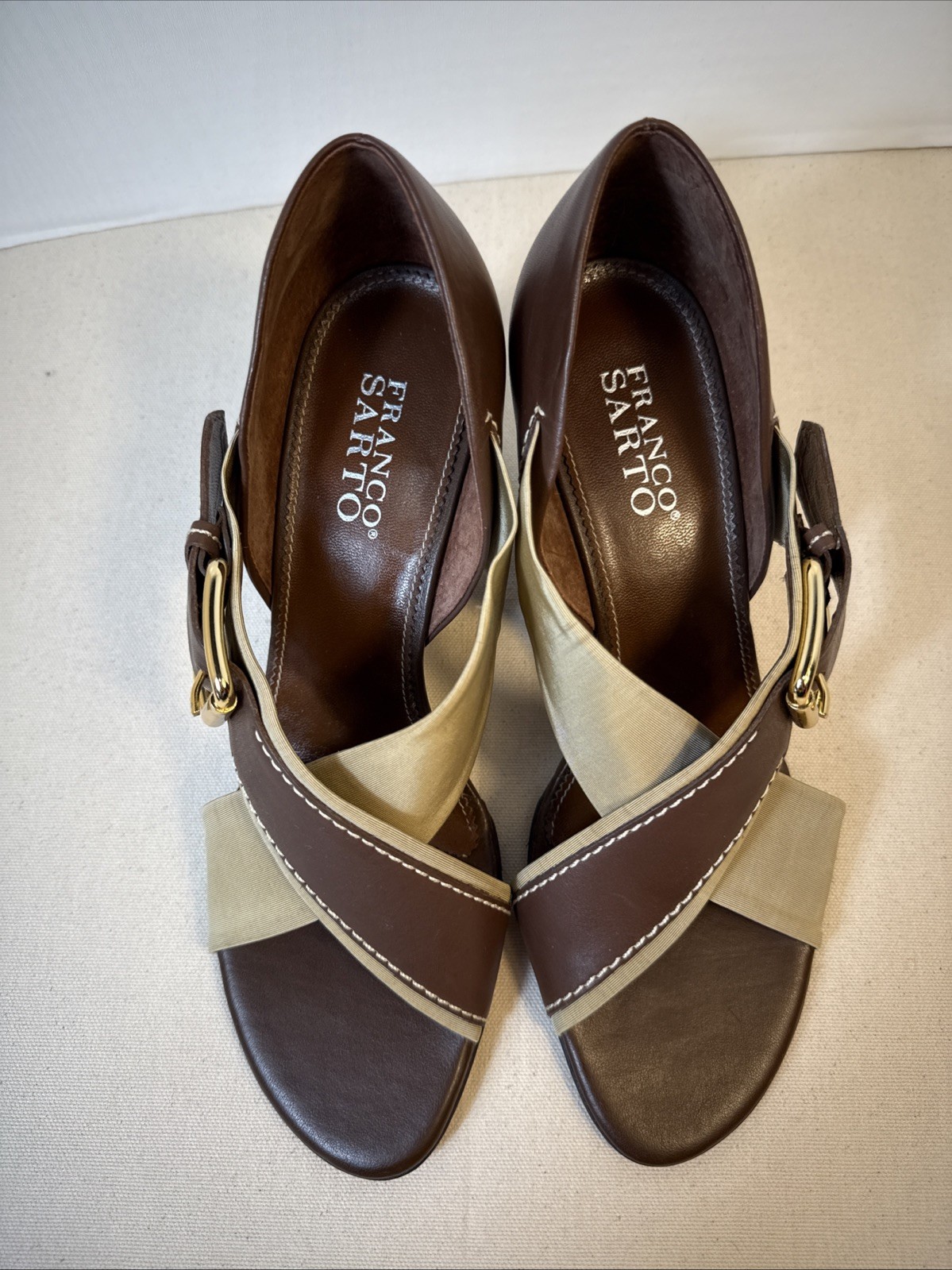 Step into style with these chic Franco Sarto women’s sandals. Featuring a crisscross strap design in a two-tone brown and beige color palette, these sandals offer both fashion and comfort. The open-toe style and adjustable gold buckle strap provide a secure, flattering fit. Perfect for spring and summer, they’re great for dressing up or down. • Brand: Franco Sarto • Style: Crisscross Open-Toe Sandals • Color: Brown and Beige • Closure: Buckle strap • Heel Style: Low block heel • Size: 9.5 M • Condition: Preowned in good condition, minimal signs of wear. Flaw, slight lifting of inner sole (see pictures). • Material: Leather and textile upper Ideal for casual outings, workdays, or summer evenings. Add them to your wardrobe today! Please view all pictures carefully, check measurements and sizes, and please message us with any questions. All shoes cleaned and sanitized. Shipping USPS ground advantage. See another item in SweetShine's listings you'd like to purchase? We combine shipping. Shop with confidence***Returns accepted within 30days! Returned items must be returned in original condition received, buyer pays return shipping cost. Follow us here on eBay. Take a peek at SweetShine's other listings. Thanks for viewing. Happy Shopping!