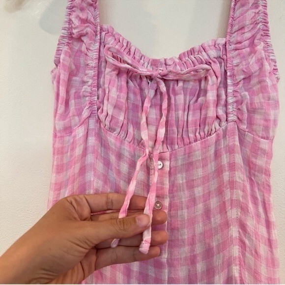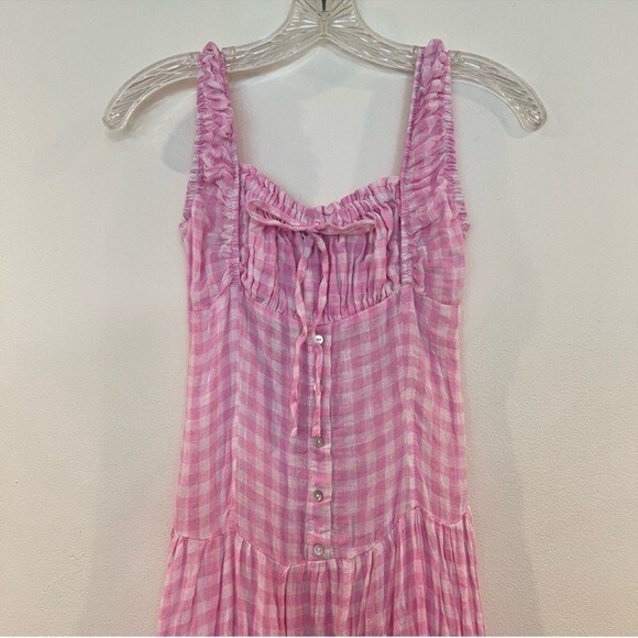 Frankie's Bikinis Christabelle 100% Linen Pink Gingham Smocked Maxi Dress Medium Preloved but in pristine used condition! Women's size medium (M). Pit-to-pit: 14 in Waist: 28 in Length: 53.5 in