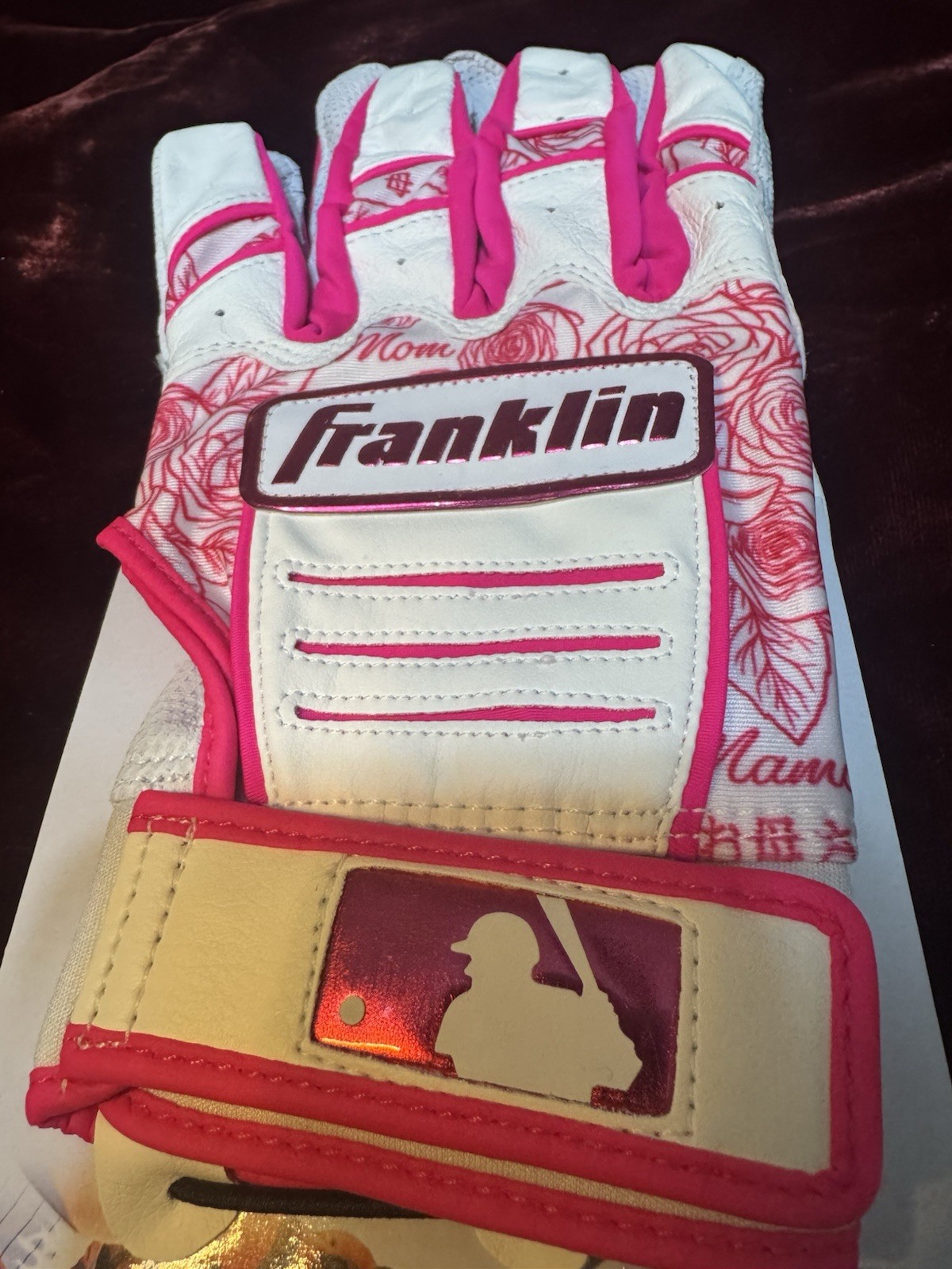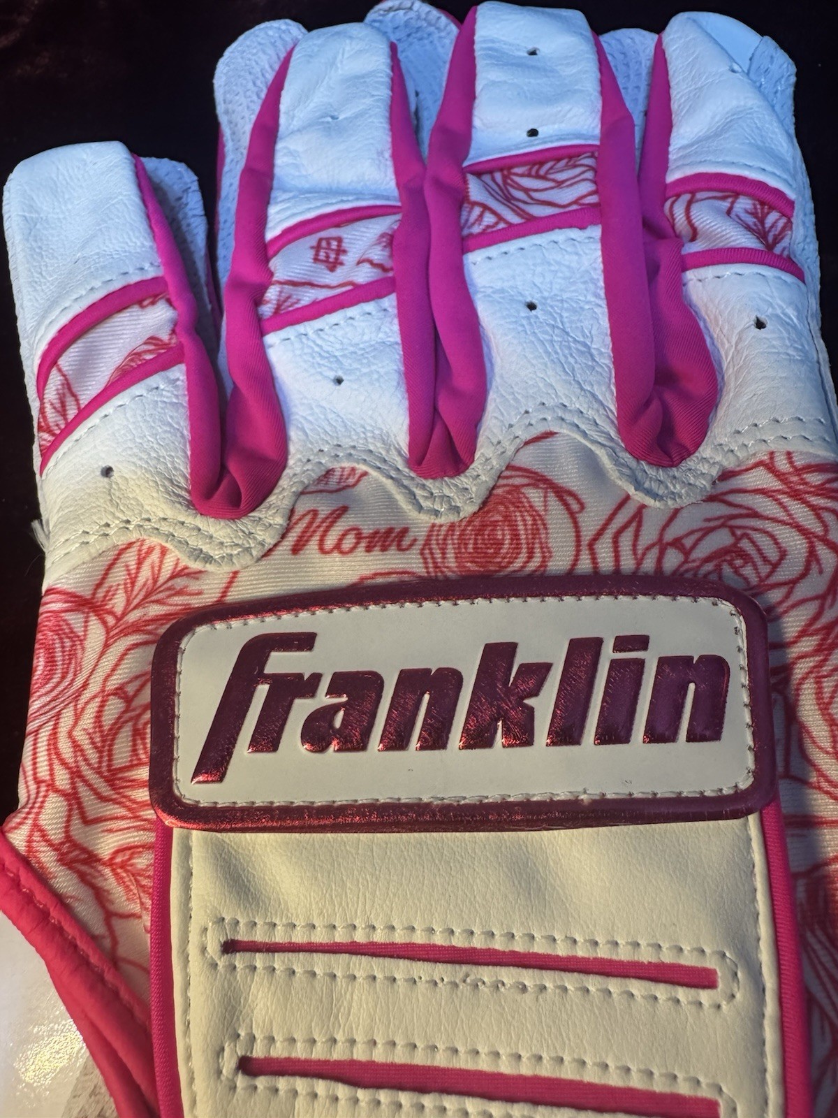 Mother’s Day Edition. Pink Men’s Medium The Franklin Sports CFX Pro Series is Franklin's most popular on-field model. These batting gloves offer a superior feel that is complemented by unique, tectonic-fit insert flexibility. The world-class quality, one-piece premium Digital Cabretta leather palm maintains softness and superior grip in all conditions while the digital leather provides strategically etched grooves to reduce palm bunching and improve grip. These gloves are a must have on the diamond this season! MLB CHOICE: As the official batting gloves of the MLB, the CFX Pro is the most popular on field batting glove used by MLB pros DIGITAL CABRETTA LEATHER: Premium cabretta leather with strategically-etched groove patterns that increase surface area, reduce palm bunching, and greatly improve grip characteristics TRI-CURVE® TECHNOLOGY: All Franklin® batting gloves are uniquely engineered to follow the pre-curved anatomy of the human hand. This reduces bunching and improves fit, feel, and performance QUAD-FLEX TECHNOLOGY®: Anticipates flexing of your palm for a perfect fit around the bat handle TECTONIC FIT INSERTS: Accommodates flex without adding bulk to the back of the hand