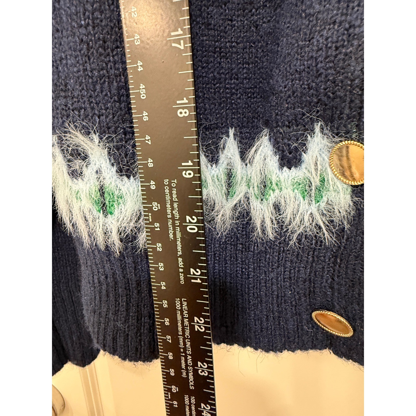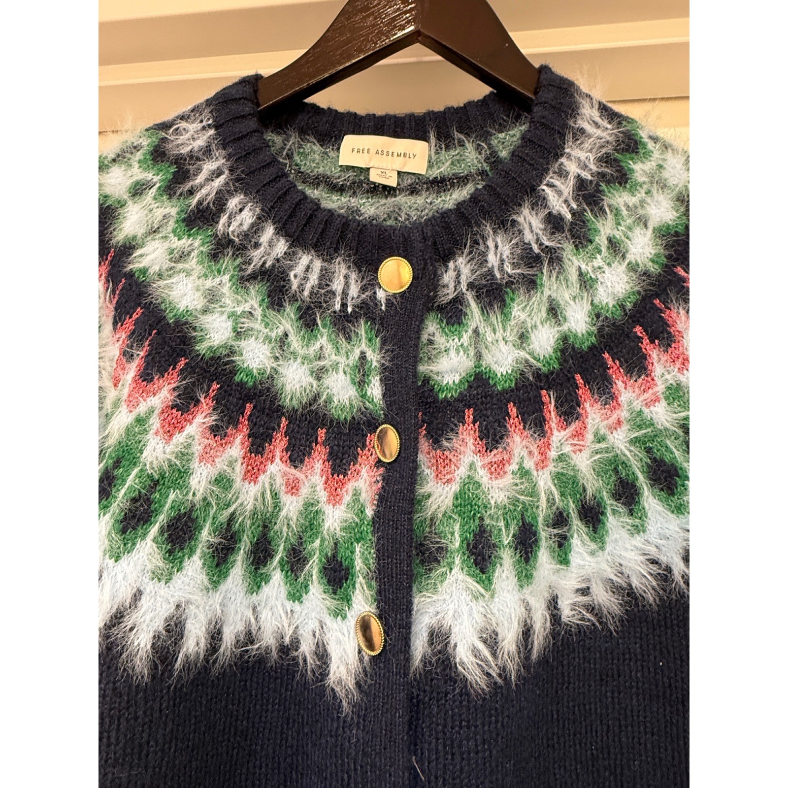Wrap yourself in cozy charm with this Free Assembly cardigan. The classic navy blue base is beautifully contrasted by a vibrant Fair Isle pattern featuring fuzzy textures in shades of green, pink, and light blue, creating a festive and inviting look. Gold-toned buttons add a touch of polished detail to this delightfully soft knit. Perfect for layering on crisp autumn days or adding a touch of whimsical warmth to your winter wardrobe. Measurements: • Chest: 23 in • Length: 21 in • Sleeve Length: 24 in Style: Cardigan Department: Women Material: Acrylic, Polyester, Mohair Neckline: Round Neck Theme: Holiday, Colorful Sleeve Length: Long Sleeve Type: Sweater Features: Stretch, Pockets Pattern: Fair Isle Fabric Type: Knit Accents: Button, Fringe Knit Style: Chunky-Knit Season: Winter, Fall Fit: Regular Keywords: Fair Isle, Fuzzy Knit, Cardigan, Navy Blue, Gold Buttons, Cozy, Winter Fashion, Festive Sweater, Layering Piece, Nordic Style, Cozy Cardigan, Chunky Knit