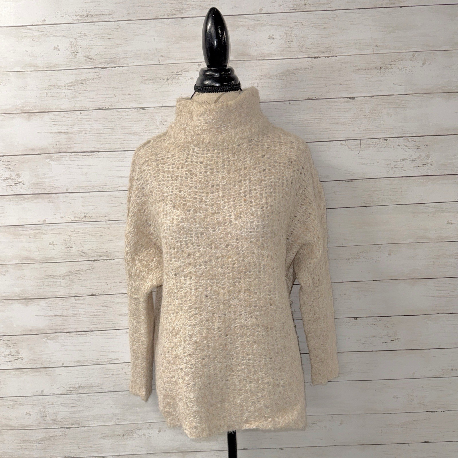 Free People size small mock neck sweater in a light beige. Pullover. Mock neckline. Chunky knit with woven hole texture. Drop shoulders. Long sleeves. Boxy fit. Straight hem. Bust: 22”, Length: 24” 89% Alpaca, 11% Nylon EUC! Retail: $148.00