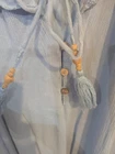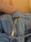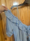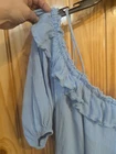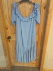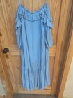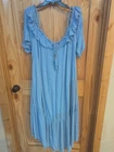 This Free People Sarita Midi Dress in size L features an off the shoulder neckline with bell sleeves and embroidered accents. The dress is made of lightweight cotton material in a solid blue color. Perfect for a casual occasion, this bohemian and peasant style dress has a cold shoulder design, ideal for summer and spring wear. Small hole please see pictures.