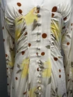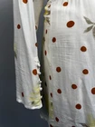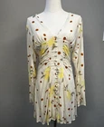 This Free People mini dress in off-white features a floral pattern, long sleeves, a V-neck, and Victorian small buttons. Made of a cotton blend with rayon fabric, it has button accents, dots, and ruching details. The dress is lined and slimming, perfect for a date night or other occasions like travel, weddings, or parties. Size XS.