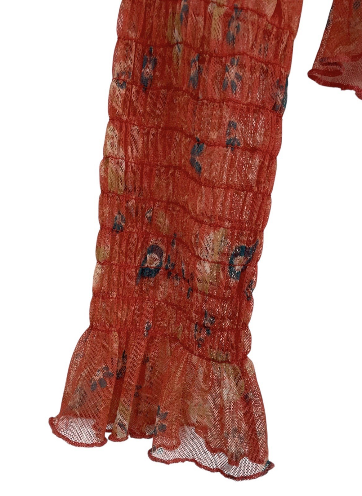 Excellent condition! -100% Polyamide -Sheer -Mock neckline -Long sleeves -Floral print -Smocking throughout -Stretchy! -Lettuce hem Armpit to armpit- 14.5” Shoulder to hem- 20” *Colors may be slightly different than what appears due to different screens and lighting. Please look closely at pics. I do not ship out on Saturdays or Sundays. Let me know if you have any questions! Feel free to send offers:)