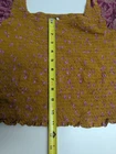 The Free People Marigold Smocked Floral Blouse in XL is a stylish and colorful addition to any woman's wardrobe. This cropped blouse features a beautiful floral pattern in bronze and purple tones, making it perfect for a casual or dressy look. With its regular fit and comfortable smocked design, this top from the popular brand Free People is sure to become a versatile staple piece in any woman's closet.