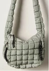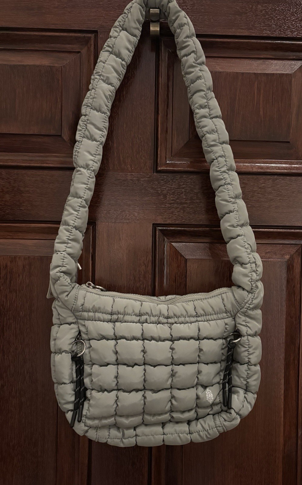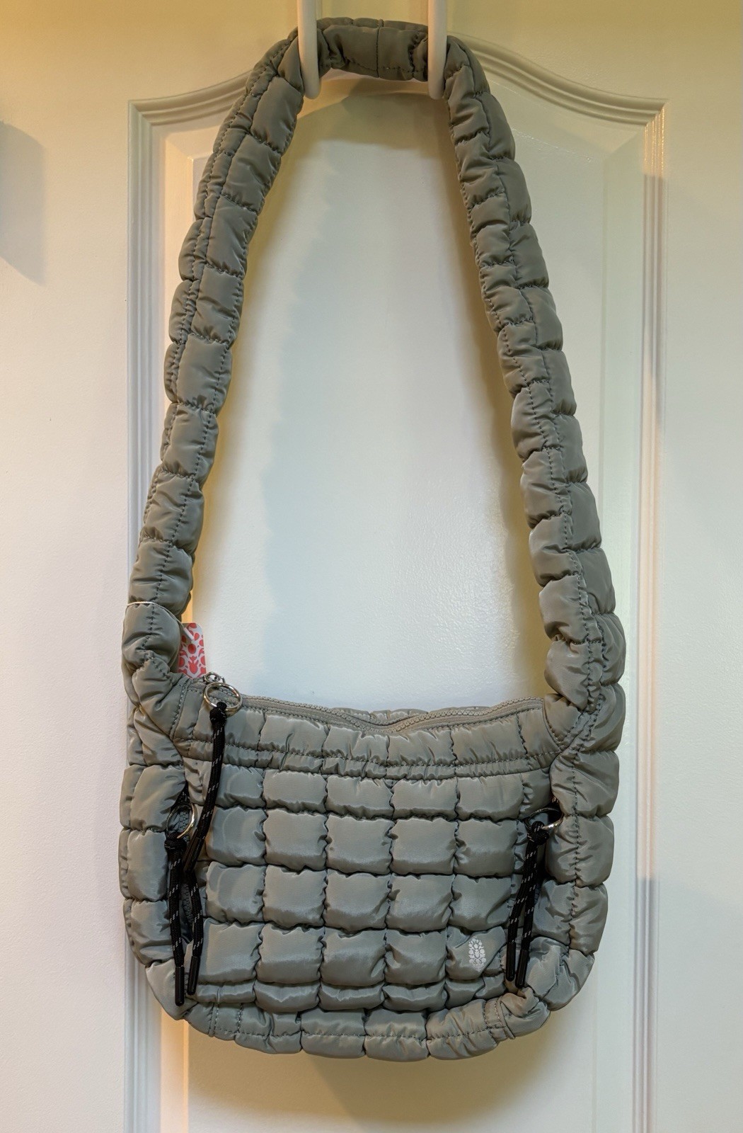 Free People Movement Mini Caryall Quilted Sling Bag. Stone Sage. New with Tags. Style No. 97921605; Color Code: 031 FP Movement fan-favorite tote featured in a sling design for versatility, with signature puffy quilting, bungee cord keyring zippers, and plenty of storage for all your essentials. Features: Fixed shoulder/crossbody strap, zip entry and exterior zip pockets; bungee cord, lined interior, interior zip pocket Great on-the-go bag, from the studio to the store, and everywhere in between.