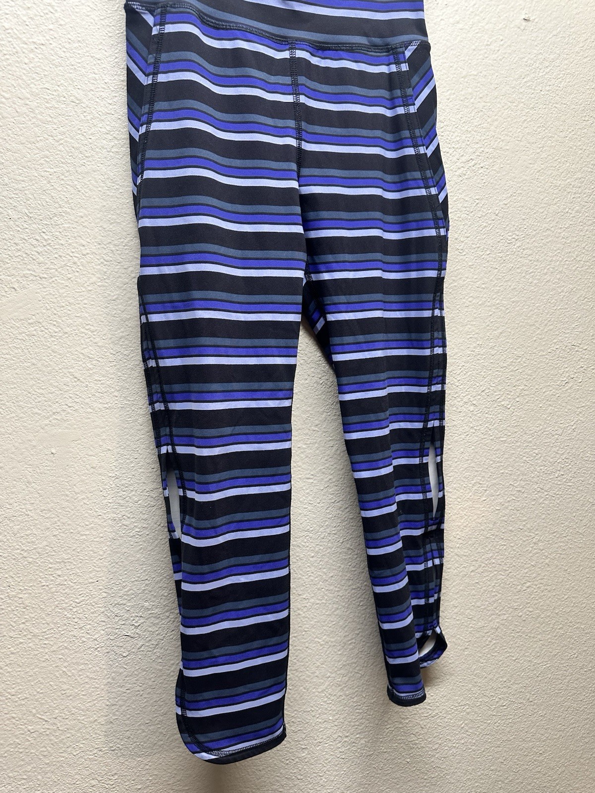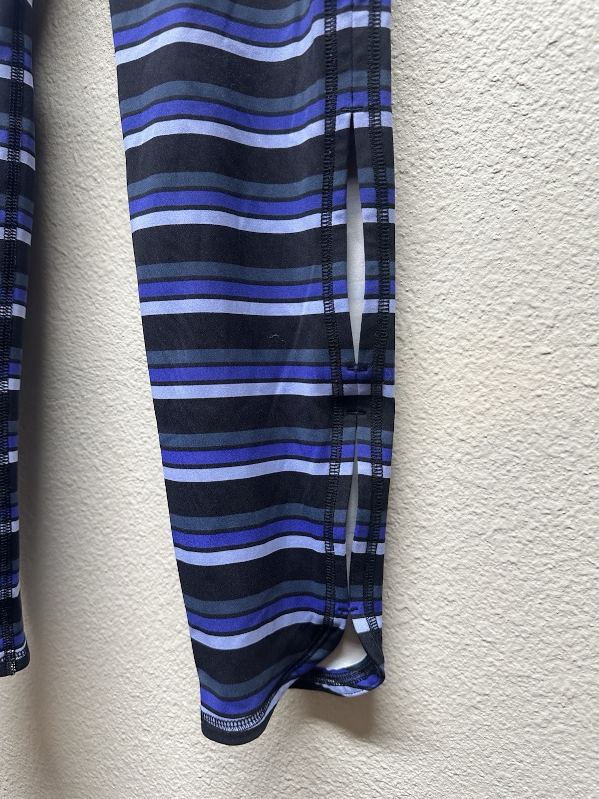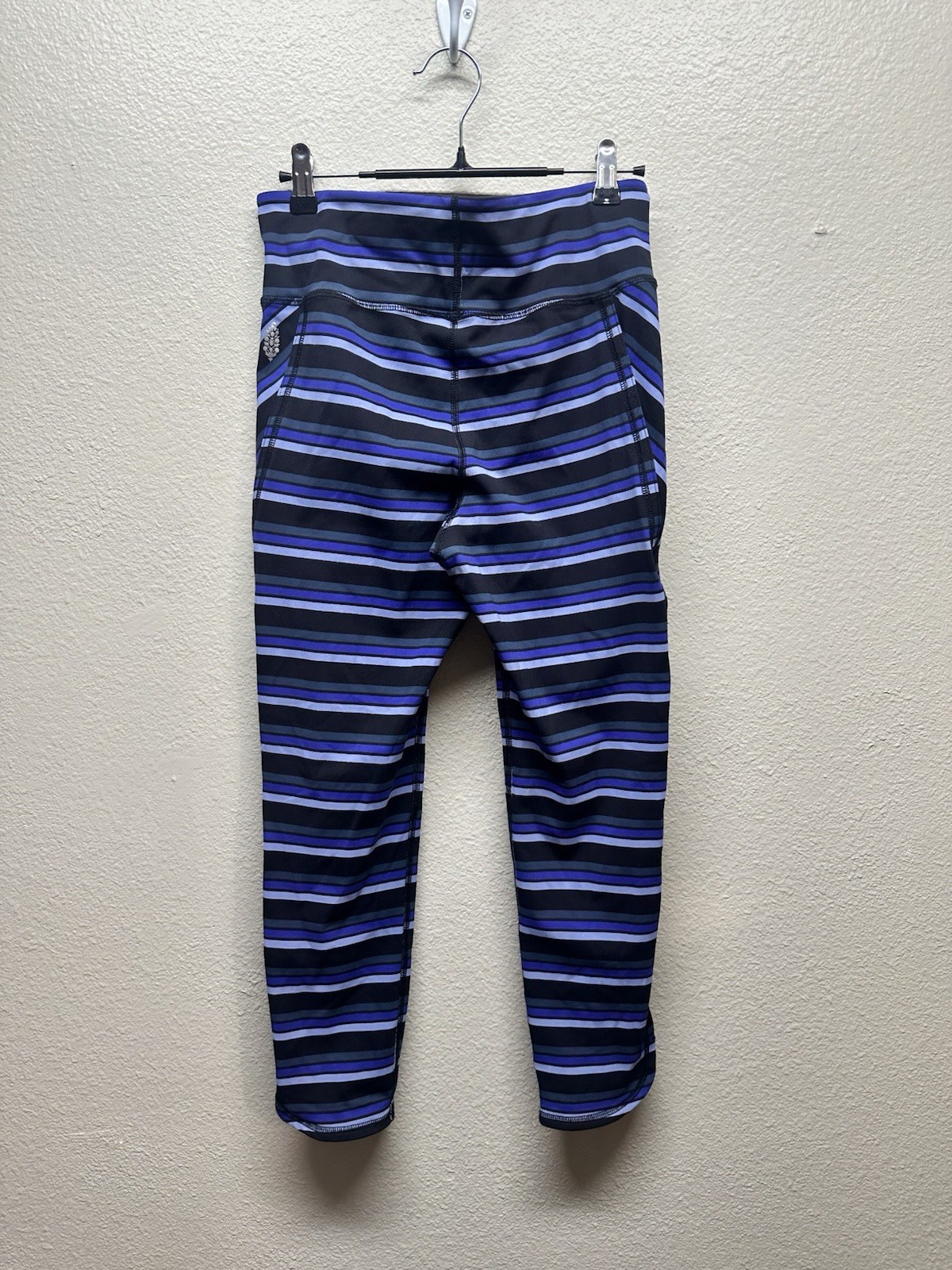 Free People Movement women’s capri leggings in a black, blue, and gray striped pattern. Designed with a comfortable stretch fit and side slits at the lower legs for ease of movement and ventilation. Ideal for yoga, workouts, or everyday athleisure wear. Size: Women’s Medium Measurements (laid flat): • Rise: 10” • Inseam: 23” Features: • Capri length • Side slits at legs • Pull-on style • Stretch performance fabric • Athletic / yoga design Fabric Content: • 68% Nylon • 32% Spandex Condition: Good pre-owned condition. No major flaws noted. Please review photos for details.