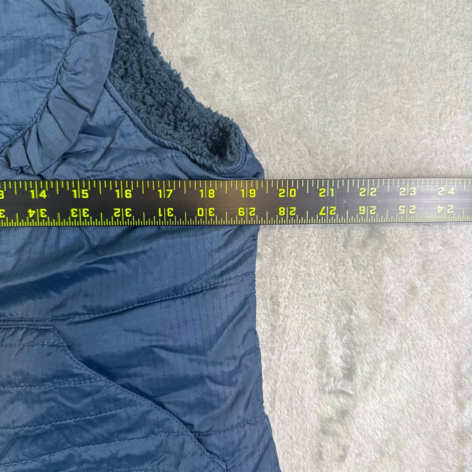 Free People Movement Snap Quilted Puffer Quinn Medium Blue Vest Sherpa Lining In great condition no holes or stains as shown in pictures Has been washed before listing Refer to pictures before purchasing as all defects are shown