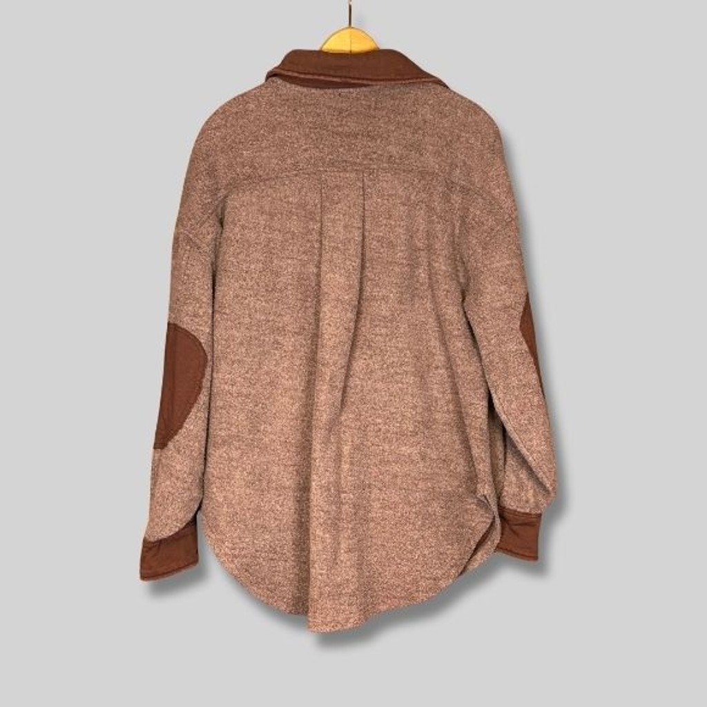 This cozy Free People shacket blends the structure of a jacket with the softness of a sweater. With its oversized fit, textured fuzzy fabric, and contrast brown trim, it’s the perfect layering piece for fall or winter. Functional pockets and relaxed styling give it that effortlessly cool Free People vibe. ● Brand: Free People ● Size: XS (oversized fit) ● Color: Heathered brown with dark brown contrast trim ● Material: Unknown (tag not shown, feels like soft wool/poly blend) ● Made in Pakistan ● Condition: Excellent Used Condition Measurements (approx): ● PTP (Pit to Pit): 25" ● Length: 26" ● Sleeve: 21" (drop shoulder) Key Features: ● Oversized, cozy fit ● Button front closure ● Two chest pockets with buttons ● Two hand pockets ● Elbow patches and contrast trim ● Fuzzy knit texture Stay effortlessly warm and stylish in this Free People oversized shacket. Perfect for layering over jeans or leggings, it’s your go-to transitional piece for chilly days. Ships Fast! #FreePeople #Shacket #OversizedJacket #FallFashion #CozyStyle #LayeringPiece #FreePeopleStyle