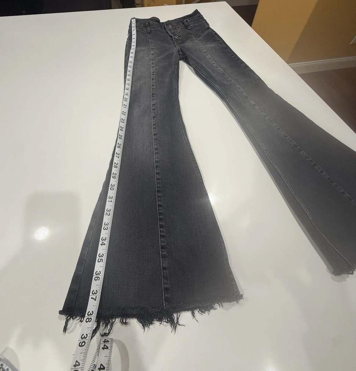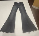 Free People High Rise Flare Jeans Women’s 26x27 Black Raw Hem Brand: Free People Size on tag: 26 Fit: High rise, flare leg Color: Black / washed black Hem: Raw hem (intentionally finished) Closure: Button fly ⸻ Measurements (approx. laid flat): • Waist: ~13” flat (26” around) • Front Rise: ~11.5–12” (high rise) • Inseam: ~27” • Outseam: ~39–40” • Leg Opening: ~10” flat (flare) ⸻ Details: • Flattering high-rise silhouette • Flare leg with great drape and movement • Button fly with branded hardware • Classic 5-pocket design • Soft, broken-in denim feel • Raw hem adds a modern, effortless edge ⸻ Alteration Note: These jeans were intentionally shortened by cutting the length to achieve the current inseam. The cut is clean, straight, and completely even, creating a natural-looking raw hem that blends seamlessly with the original design. The finish looks modern, polished, and perfectly complements the flare silhouette. ⸻ Condition: Very good pre-owned condition. No holes, stains, or major flaws noted. Any fading or wash variation is part of the design. ⸻ Shipping: Ships same or next business day, securely packaged, from a clean, smoke-free home.