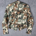 This Free People women's jacket is a stylish green camouflage blazer with a military utility design. Made from cotton canvas, it features long sleeves and a short length with button closure. The fitted silhouette and button accents add a touch of sophistication to the casual, army-themed jacket. Perfect for all seasons, this lightweight piece is ideal for winter and fall. Made in China, this Free People blazer is a versatile and colorful addition to any wardrobe.
