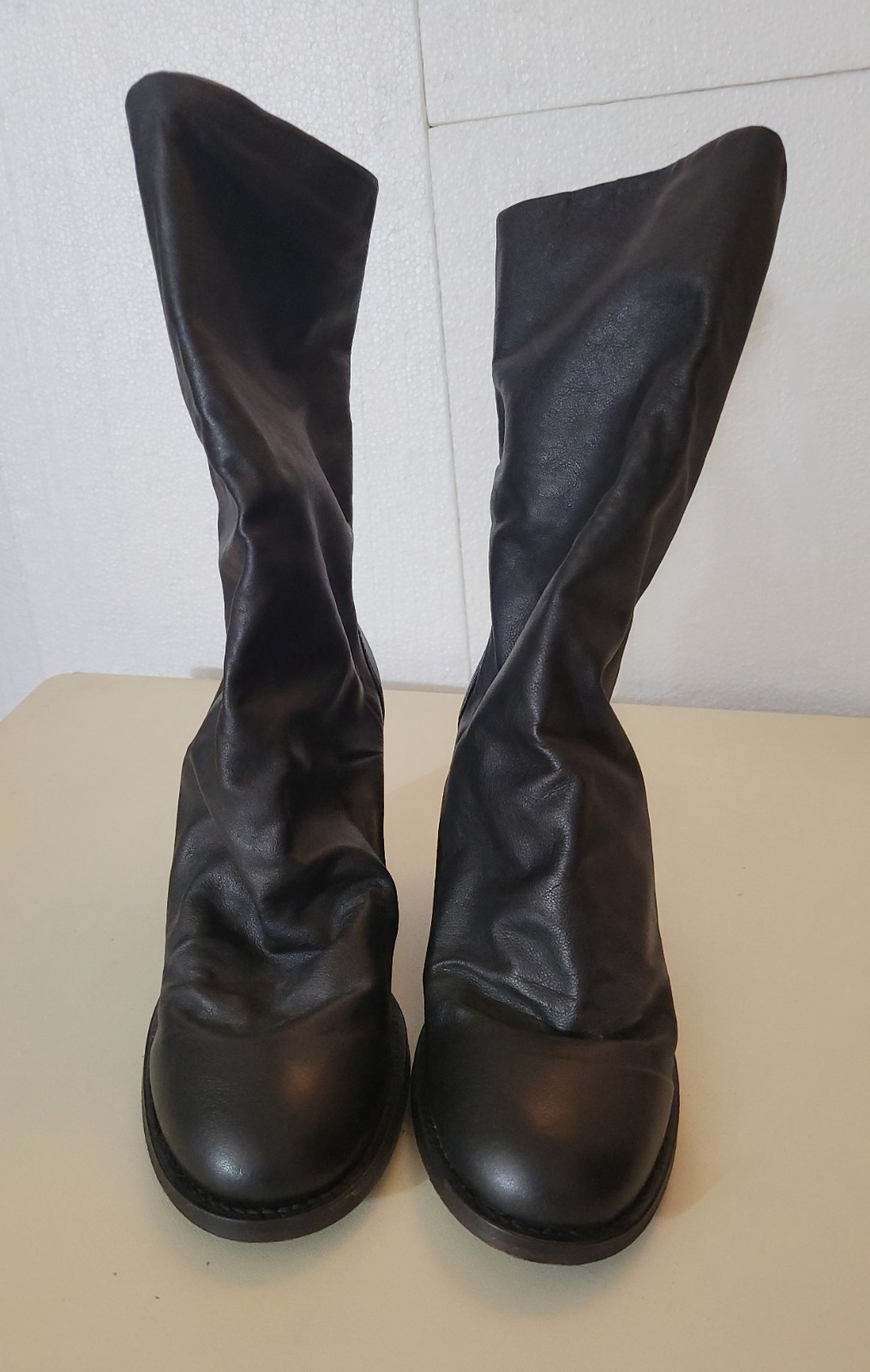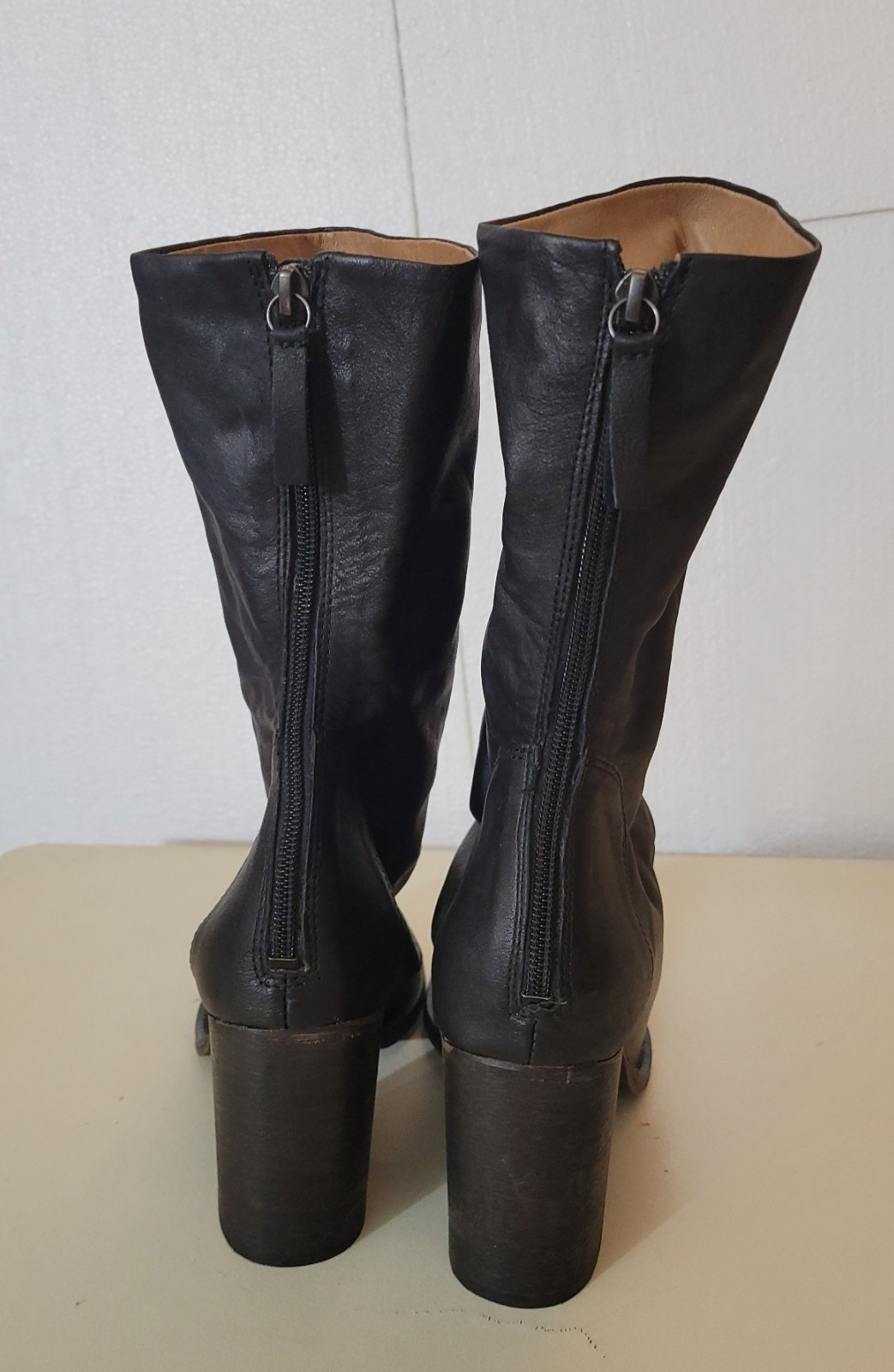 The Free People Women's Mid-calf Block Heel Boots in Size 41 are a stylish and versatile addition to any woman's wardrobe. These black leather boots feature a round toe, zip closure, and a high block heel for added elegance. With a comfortable padded insole and a solid black color, they are perfect for various occasions including travel, parties, and casual outings. The mid-calf shaft style and unique accents like the zipper detail and natural distressed look add a touch of bohemian flair to the hipster-inspired design. Made in Portugal, these boots offer both quality craftsmanship and on-trend style.
