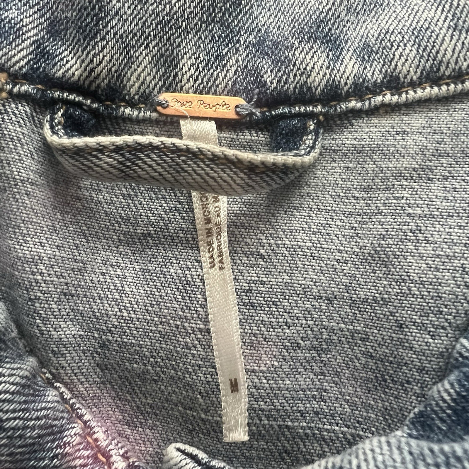 Free People’s Rumors light wash denim trucker jacket. One stain on a sleeve shown in photos. Women’s size Medium with measurements below. Pit to pit: 19.5” Shoulder to hem: 21.75”