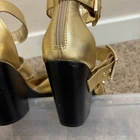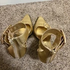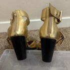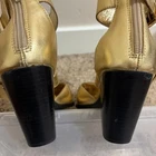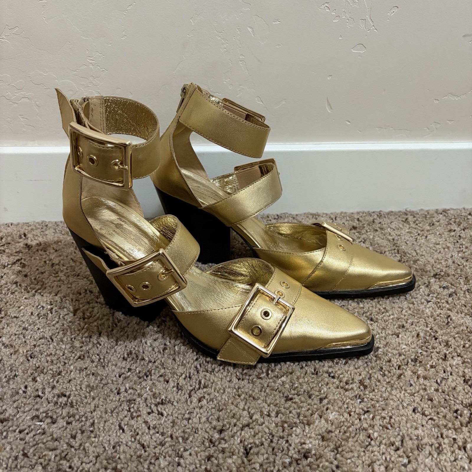 Free People Jeffrey Campbell Hendrix Heels, Metallic Gold, Women’s Size 9 Details Strut your stuff in these so cool chunky heels from Jeffrey Campbell featuring three buckled straps and a pointed toe. Adjustable straps Tipped toe detail Cushioned insole Jeffrey Campbell Since 2000, Campbell and his wife Christina have created footwear that’s at once accessible, comfortable, and fashion-forward, delighting their fans with a constant stream of new styles that reflect an uncanny ability to anticipate upcoming fashion trends. Heel Height: 3.25 in Contents: Leather, Rubber In good condition! Does have some wear all around the shoes including creasing. Also has some scuff marks and scratches. The back heel of the right shoe had a small chip/scuffing. Please see all pictures before purchasing.
