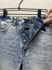 Free People X Zuri Ultra High Waist Ankle Mom Jeans in size 25, featuring an acid wash blue denim fabric with distressed accents and a button closure. This grunge and bohemian-inspired style has a slimming fit, regular rise, and is made of a blend of spandex and cotton. Perfect for a 90s-inspired look with a touch of modern flair.