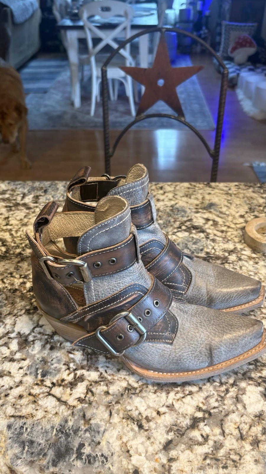 The Freebird Women's Leather Mayhem Size 6 Ice Boots are stylish ankle boots with a pointed toe, perfect for casual occasions in the fall and spring. Made of high-quality leather with a block heel, these boots offer a comfortable and fashionable option for everyday wear. The gray color and regular calf width make them versatile for various outfits, while the Freebird brand adds a touch of personality to your look. Made in Mexico, these leather boots are a standout addition to any woman's wardrobe. These run long. I’m a true size 7 and they fit perfectly.