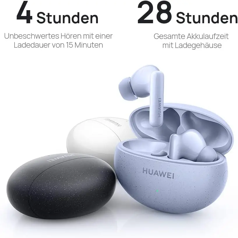 Compact and Comfortable The earbuds are shorter and 11% lighter than the previous product5. With 3 sizes of soft skin-friendly silicone ear tips, you can enjoy customized wearing comfort. The lightweight charging case makes it highly portable in daily life, so that it's always on hand when you need a boost. Hi-Res Audio to Tickle your Ears Hi-Res Audio to Tickle your Ears HUAWEI FreeBuds 5i is Hi-Res Audio Wireless certificated, featuring a wider frequency response, full-link high-resolution sound for HD audio sources6, and multiple EQs to match with a wide range of different styles, for a tailor-made listening experience. The earbuds' 10 mm dynamic driver units work in tandem with its polymer composite diaphragm, to deliver sterling sound at low, medium, and high frequencies, making it an ideal for pop music.Carefree Wearing, as You Please HUAWEI FreeBuds 5i reduce Carefree Wearing, as You Please sound with Hi-Res certification The earbuds' 10 mm dynamic driver units work in tandem with its polymer composite diaphragm, to deliver sterling sound at low, medium, and high frequencies, making it an ideal for pop music.HUAWEI FreeBuds 5i reduces low-frequency loss when the earbuds are not a seamless fit with your ears, or when they are being worn sub-optimally, delivering crystal clear audio. The earbuds automatically switch between Ultra, General, and Cozy modes, to adapt the effects to the surroundings, such as a busy airport, subway station, restaurant, office, or quiet home, and eliminate up to 42 dB of background noise.AI Noise Cancellation, for Clear Calls AI noise cancellation, bolstered by AI neural network algorithms, distinguishes voices from ambient noise, so that you can be heard loud and clear. All-Purpose Interconnections The audio connection center in the AI Life app makes it easy to manage devices connected to the earbuds, and switch listening devices at a moment's notice. Open the charging case to pair the earbuds with a nearby HUAWEI phone or tablet via an automatic pairing prompt