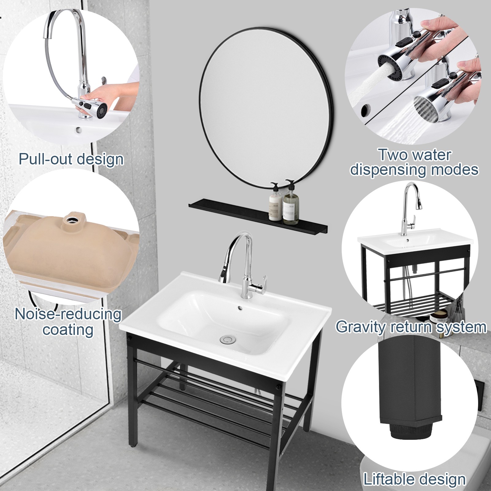 Store category Sign Up Now ! You may also like Product Description Bullet Points: Effortless Maintenance: The pull-out design of the ceramic laundry sink set brings convenience and efficiency to your daily laundry routines while offering a stylish touch Effortless Water Temperature Regulation: Featuring an all-copper faucet and hot/cold water hoses, this sink enhances your cleaning routine with effortless water temperature control, delivering a more enjoyable and convenient flushing experience Ideal Durability: Featuring high-quality ceramic sink and stylish copper faucets supported by sturdy stainless steel brackets, ensuring enduring beauty and functionality Easy Storage Solution: The spacious console area, along with smartly designed storage and towel racks, creates a well-organized and beautiful laundry space. Keep your bathroom supplies tidy Easy Mounting: Just prepare a small amount of glue, and, for a flexible installation that's easy and convenient, you can easily install by yourself; no additional accessories are required Introducing a unique design utility sink with faucet for a more convenient flushing experience! Featuring sturdy stainless steel brackets for stability, keep your laundry space tidy and beautiful. Just a small amount of glue needed for easy installation. Specifications: Product Name: Laundry Utility Sink Wash basin sizes: A: Height: 81cm 32in Length: 71.5cm 28.15in Width: 48cm 18.9in Height from ground: 24cm 9.5in Distance between legs: 44.6cm 17.56in Basin sink length: 47cm 18.5in Basin sink width: 30cm 11.8in Basin sink depth: 14.5cm 5.7in B: Height: 81cm 32in Length: 71.5cm 28.15in Width: 48cm 18.9in Height from ground: 24cm 9.5in Distance between legs: 44.6cm 17.56in Basin sink length: 40cm 15.75in Basin sink width: 30cm 11.81in Basin sink depth: 16cm 6.3in Wash board length: 30cm 11.8in Washing board width: 20cm 7.9in Hot and cold copper faucet size: Height: 58cm 22.83in Telescopic hose length: 80cm 31.8in Packing List: Wash basinx1 Stainless steel bracketx2 Rack rodx7 Drain pipex1 Faucetx1 Faucet gasketx2 Faucet counterweightx1 Bracket bottom leg gasketx4 Bracket top PP coverx4 Expansion boltx2 Long screwx2 Short screwx8 Screw decorative coverx10 Decorative plate in front of sinkx1 Payment Delivery details Terms of sales About us Feedback & DSRs Payment Before you palce an order, please kindly make sure that you have a paypal account. We accept PAYPAL payment only. Payment should be completed within 2 days after auction closed, or unpaid dispute will be filed for an closing auction. An unpaid case will be filled after 4 days. Delivery details We ship to your eBay address. Each package will be shipped to US by UPS Regular Parcel with tracking number. Please check your shipping address carefully before checkout, it can't be changed if order completed. All items will be shipped within 1-2 business day upon receipt of payment.Orders placed on weekend will be shipped within 3 days. If you do not receive your item in 7-10 business days.please contact us immediately for further assistance. We will be responsible for any damages or losses incurred in the shipping process. About us We maintain high standards of excellence FIVE STAR and strive for 100% customer satisfaction! Positive Feedback is very important to us. We hope that you contact us immediately Before you give us neutral or negative feedback, so that we can satisfactorily address your concerns. We promise to offer the lowest price and high quality produce. Our working time: From Monday to Friday(9:30 am to 18:00pm), we don't working on holidays ,hope you can understand and know that , thank you. Please always talk to us via ebay Message. We appreciate your business and look forward to growing our e-Bay sales with satisfied customers. Feedback Contact us If you have any questions, please feel free to contact with us by ebay Message during our business hours ( 9:30a.m. to 5:30 p.m.), or email us through eBay, we will try our best to help you to resolve it. For any presale or after-sale questions,please do feel free to email us! Due to the time difference, each email will be replied within 1 working day,and weekend will be delayed a bit. Feedback