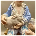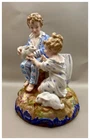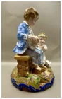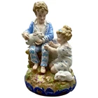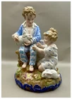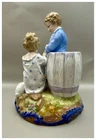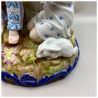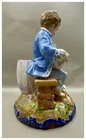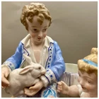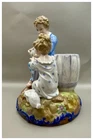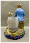 This playful spill vase is an antique gem from the Limoges region in France dating from 1868 to 1883. Semi gloss finish. The piece was modelled by Paul Duboy for Gustave Demartial and Tallandier manufacturer, who prided themselves for being artists first and often used their talents to decorate vases and figurines. The piece features a delightful scene of a young boy, adorned in a blue coat embellished with flowers, standing before a barrel holding and petting a bunny, while a young girl in a floral dress sits nearby, eager to interact with the adorable rabbit. Another hare sits next to the girl nibbling on some delicious grass. The full piece is rendered in vibrant colors and the barrel doubles as the spill vase, with the artist's signature, Paul Duboy, etched into the ground. A perfect addition to any collection, this set is sure to delight collectors and would make a thoughtful gift for a special occasion or loved one. Limoges porcelain, renowned for its exceptional craftsmanship and delicate beauty, originates from the Limoges region of France and has been a symbol of luxury since the 18th century. Various companies in the Limoges area have contributed to the legacy of Limoges porcelain. Renowned for its purity, whiteness, and the ability to showcase intricate hand-painted designs, Limoges porcelain remains highly sought after by collectors and is often utilized for fine china, decorative pieces, and luxury tableware. Paul Duboy (1830-1887) was a French sculptor known for his bronze and porcelain sculptures. He was famous for his work in Limoges, France, particularly for his porcelain modelling work for Limoges porcelain manufacturers. His work often depicted elegant figures and mythological themes. His works are highly regarded for their artistic quality and are sought after by collectors of Limoges porcelain. Spill vases, which were popular in the 19th century, were designed to hold thin sticks or spills used for lighting candles, pipes, or fires. These decorative vessels varied widely in design, ranging from simple ceramic containers to ornate pieces made of glass, metal, or porcelain. Spill vases were both functional and decorative, commonly displayed in homes and are now sought after by collectors. Condition – This piece is in remarkable condition given it’s age. We did find any chips, cracks, or crazing. There is a small hairline fracture on the underside of the base of the piece. Please see photos for additional information about the item condition. The piece measures 6" (L) x 6" (W) x 8.75” (H). Our eco-friendly packaging ensures that your order arrives safely while minimizing its impact on the environment! Please note that all of our vintage items are pre-loved and may show signs of wear and age. We strive to accurately describe each item's condition and any flaws, but please keep in mind that vintage items are not always in perfect condition. If you have any questions please don't hesitate to contact us. We want you to be completely satisfied with your purchase and will do our best to provide you with all the information you need to make an informed decision.