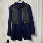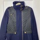 This stylish quilted navy coat by French Connection boasts functional zippered pockets, a high collar for added warmth, and stylish gold-tone accents that enhance its elegance. BRAND: French Connection CONDITION: Gently Used (Some light scratches on buttons, cuffs gently worn - see pics) US SIZE: 6 COLOR: Navy and black MATERIAL: Shell Main 60% Wool 30% Polyester 10% Viscose/Rayon Shell 100% Polyester Fill 100% Polyester FEATURES/ACCENTS: - Quilted front panels for a trendy look - High collared design with striking gold buckles - Two deep pockets and a zippered pocket on the chest - Gold-tone buttons and accents ABOUT ME: I accept reasonable offers. Same or next day shipping. Questions? I’m always here to help with sizing, styling, or other inquiries. Thanks for stopping by! Have a great day. 😻ClosetKitty23