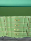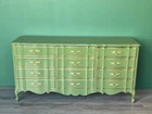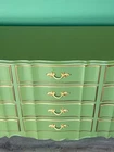 Vintage French Provincial Dresser by Dixie. This is a solid built dresser of twelve drawers with dovetail joints This dresser is newly refinished in a high gloss green lacquer with gold painted hardware Dimensions: 68”Width x 18”Depth x 34”Height See pictures and condition for reference SHIPPINDS IS NOT INCLUDED, SHIPPING WILL BE HANDLE SEPARATE IF YOU NEED ASSISTANCE WITH SHIPPING PLES LET US KNOW, THANK YOU