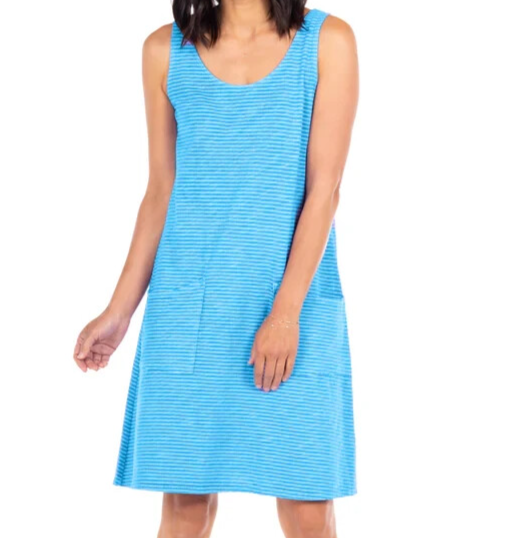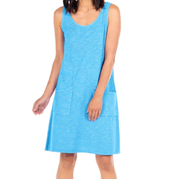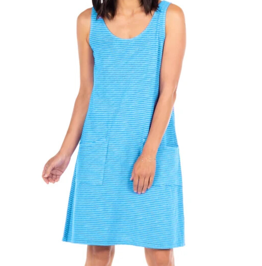This dress is a dream—soft, breathable cotton with a flattering drape that moves beautifully. The pinstripe adds a chic touch, and the pockets are so handy! The fit is true to size, with a relaxed yet polished look. Perfect for casual outings or dressing up with accessories. Love the scoop neck and bra-friendly straps—so comfortable all day. A must-have for effortless style!