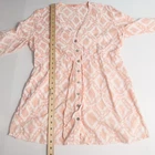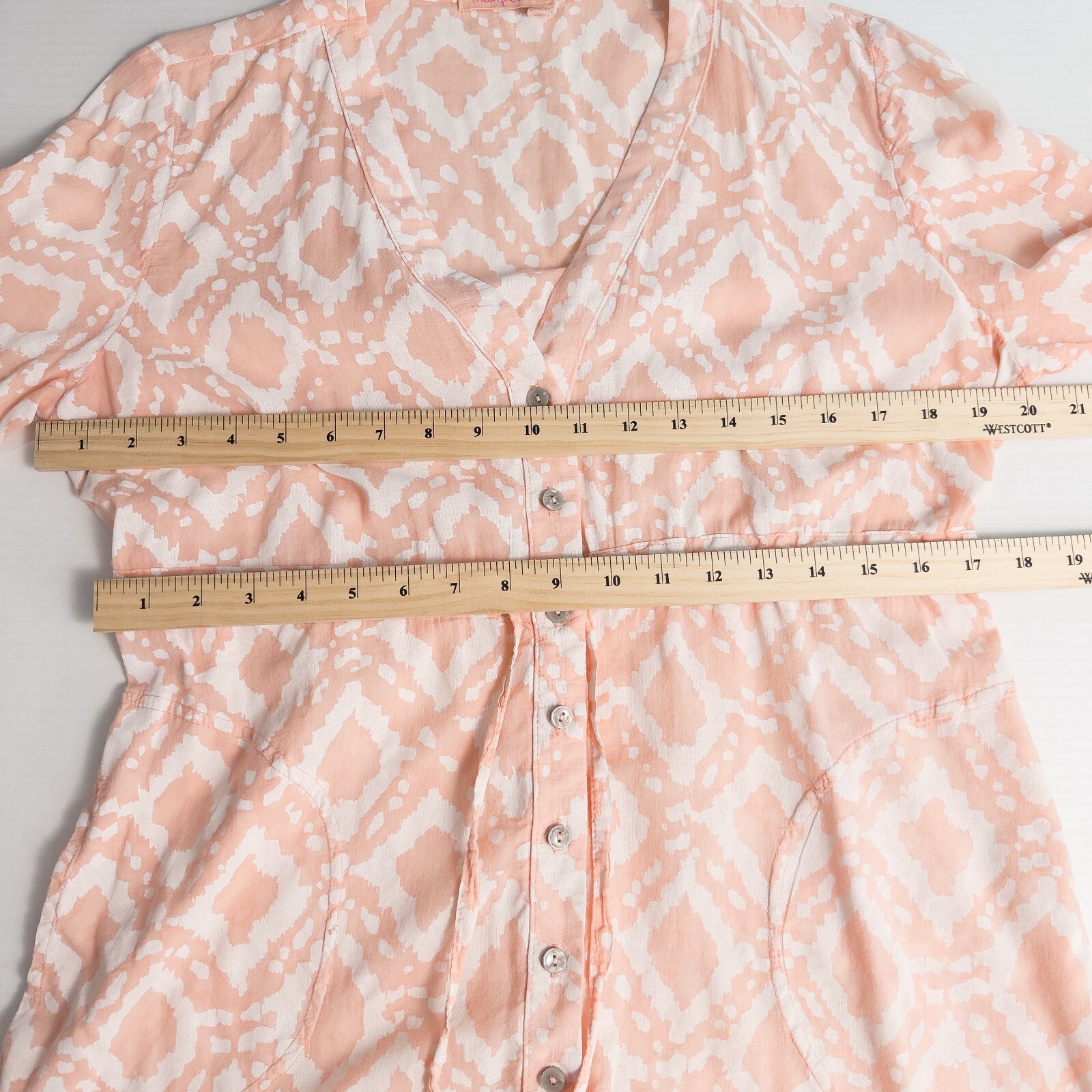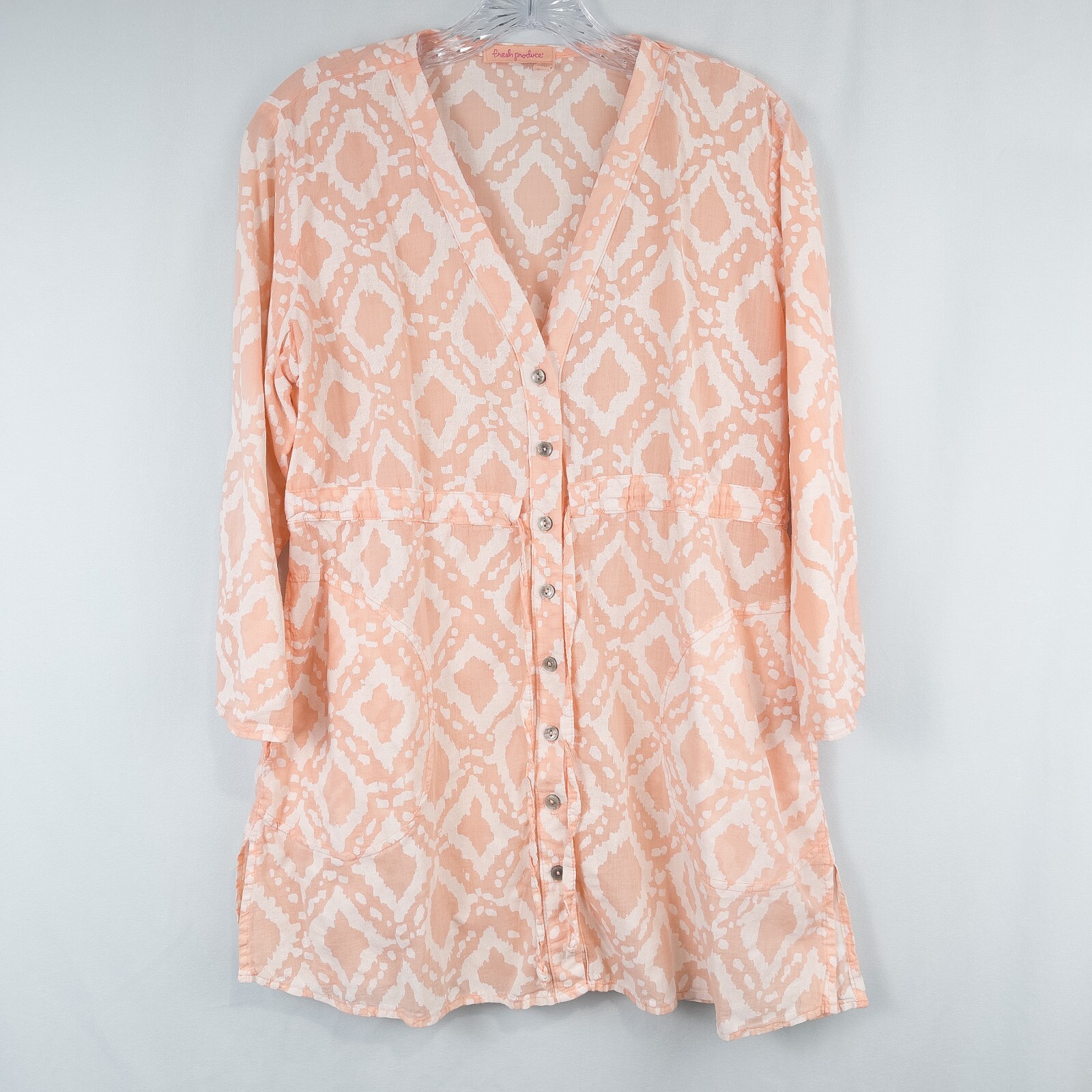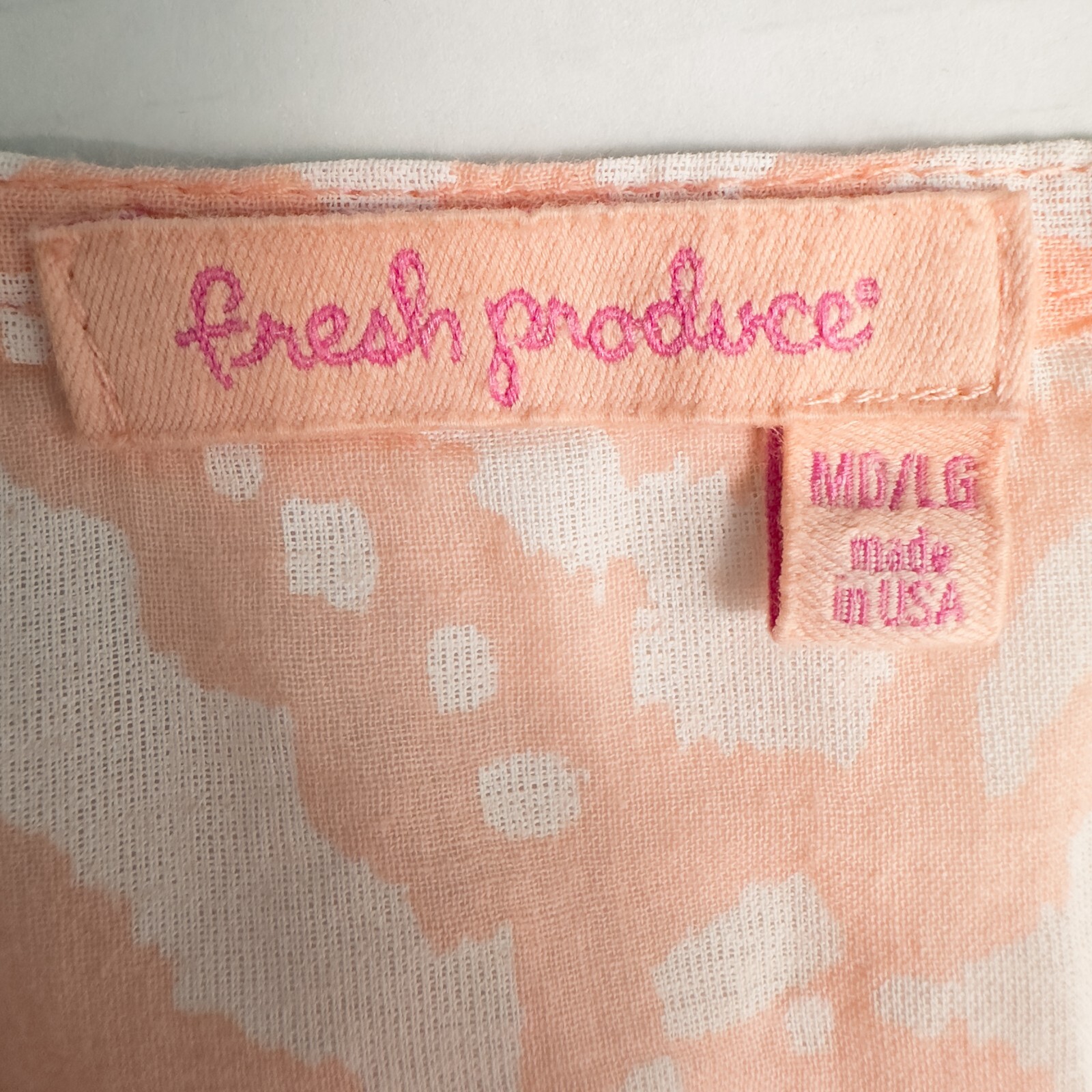 Fresh Produce Destination Voile Tunic Top * Condition: Good pre-owned condition. There is a loose thread on the right pocket. No stains or holes. Please see photos. * Size: MD/LG - Fits closer to a medium and has no stretch. Please see measurements. * All measurements are approximate and taken lying flat. Please see photos as well. * Chest: 20” pit to pit * Waist: 17” across * Length: 28.5” from shoulder to hem * Color: Peach Pink, White * Pattern: See photos * Material: 100% Cotton * 3/4 length sleeves with roll tabs * Lightweight semi-sheer woven cotton fabric * Cinched tie waist * Button front closure * V-neck * Side pockets * Style Number: 21780 * Machine Washable Style Profile: Boho, Bohemian, Beach, Summer, Swim Coverup, Vacation, Travel All of my items are stored in a smoke-free, dog-friendly home.