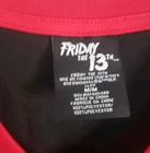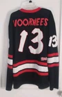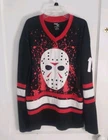 This is a black Friday the 13th Jason Voorhees Halloween hockey jersey in size M. It features a V-neck design, made of polyester jersey fabric. The shirt is part of the Friday the 13th product line and is themed around horror and Halloween, representing the character Ason Voorhees from the Friday the 13th franchise. The fit is regular and designed for men or women.