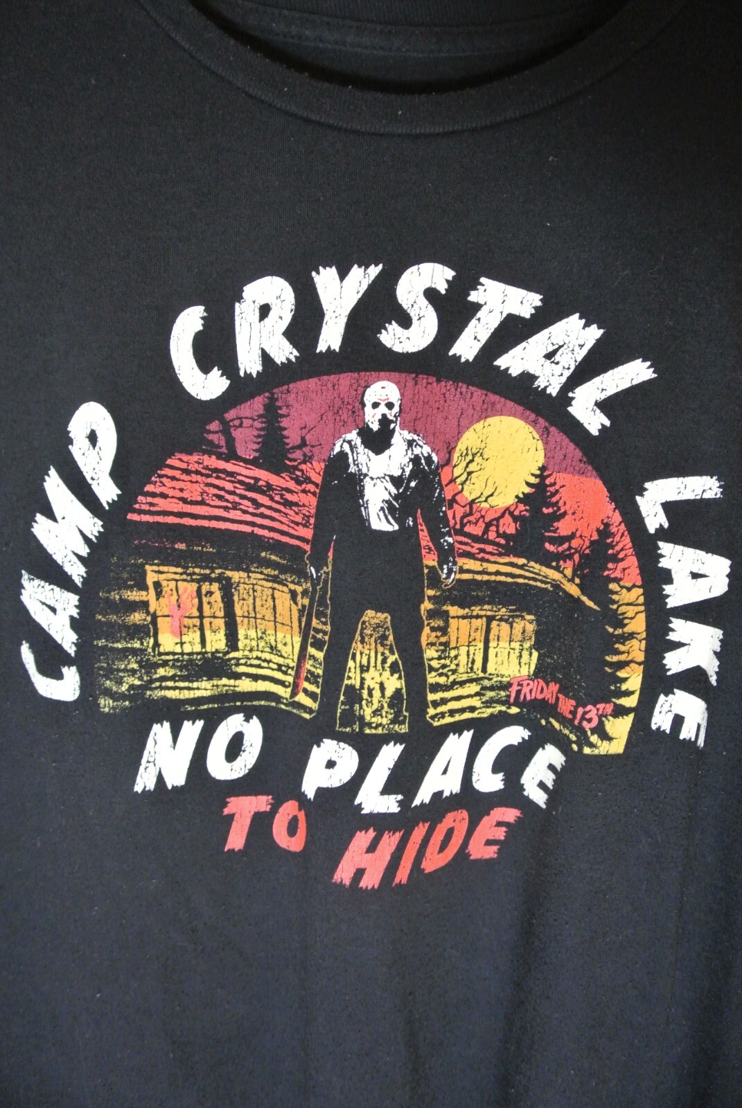 This Friday the 13th Men's XL T-Shirt features a short-sleeve design in black cotton fabric. The front graphic showcases the iconic Camp Crystal Lake motif, emphasizing the horror theme of the shirt. Manufactured by Fifth Sun in the United States, this regular fit tee belongs to the Men's Novelty T-Shirts collection, bearing the Friday the 13th brand and character family. With a bold "No place to Hide" slogan, this graphic tee is ideal for fans of the franchise who appreciate a touch of horror in their wardrobe.