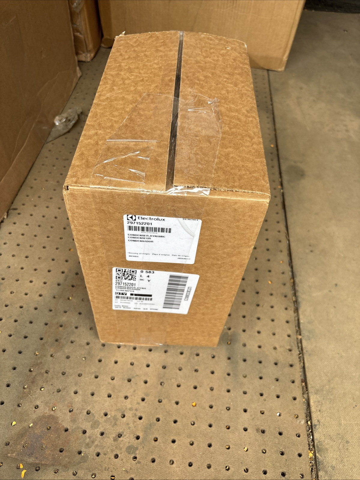 This is a Frigidaire condenser, model number 297152201, manufactured by Frigidaire. It is compatible with various Frigidaire, Kenmore, Tappan, and Electrolux brand refrigerators and freezers. It is an OEM part for various equipment models. This product may contain materials that require a California Prop 65 warning for cancer and reproductive harm. For compatibility with specific models, customers are advised to message for further information.