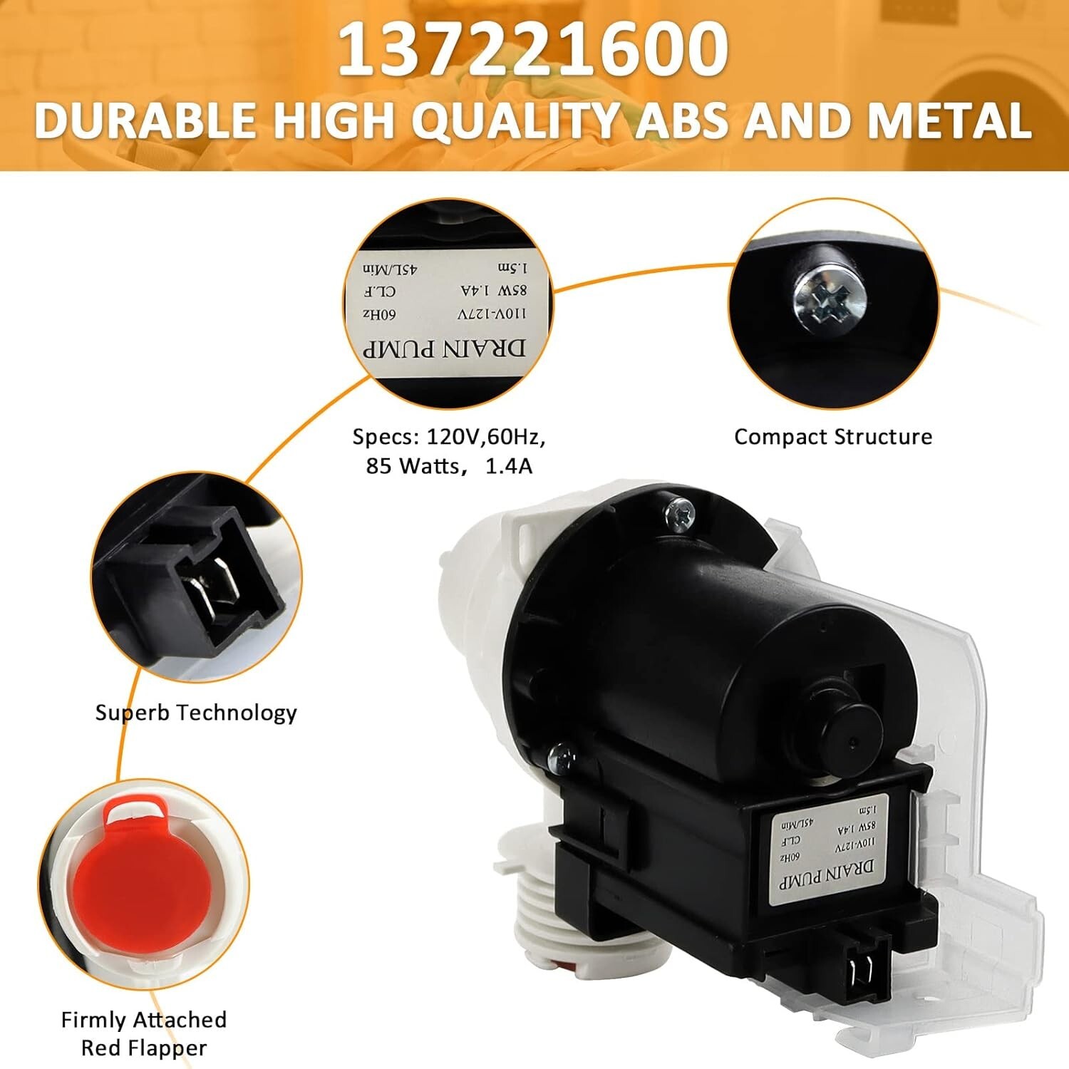 Washer Drain Pump Askoll M65 M89 M222-5 Frigidaire 29401600 137108100 131724000 Color: Black White Red Material: plastic metal Style 137221600 Washer Drain Pump Power Source: ['AC'] Item Weight 1.8 Pounds Maximum Flow Rate: 45 Liters Per Minute Maximum Lifting Height: 1.5 Meters Voltage: 120 Volts Parts Number:Replacement washer drain pump 137221600 Scope of Applicatio]:Works with most top name brands(fr.igidaire, westinghouse, k.enmore, gibson, c.rosley, uni, electrolux),If you are not sure if part is correct, ask us in Customer questions & answers section or visiting the AMI PARTS storefront.We’re happy to help ensure you select the correct part for your washer Directly Replaces:AP5684706, 131724000, 134051200, 134740500, 137108100, 137151800, 137151800KITK, 2754548, ER137108100, PS7783938, TJ137108100 Fix Symptoms:Water is leaking out of the bottom of the machine, the drum will not drain water, or there’s an unusual noise during use We have an excellent service team and you can contact us if you have any questions Tips: Please cut off the power before installation Return Policy: We offer a 30 day return policy from the receiving date. Please contact us for a Free Return Label. Please use our return label so it will go back to our supplier and we can do a refund or replacement afterwards. Feedback: Your satisfaction is very important to us! If you have any problem with your order, please contact us and we will do our very best to make you satisfied. As long as you are happy with your purchase, please leave a positive feedback for us. We will always leave you a positive feedback in return. If you have any problem with your purchase, please do not leave a negative feedback. Please Contact us ... and your issue will be solved quickly and positively We are a small family-owned business trying to make a living, not a huge company that does not care ... We will ALWAYS do our best for you!