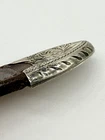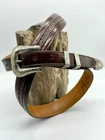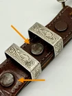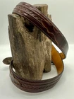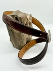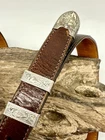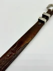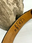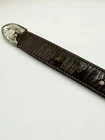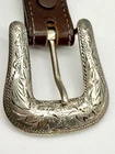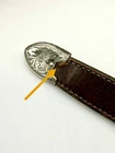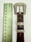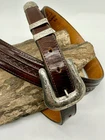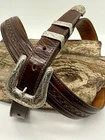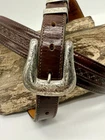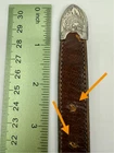 Read all and view all photos carefully please. See photos with arrows to view damage closely. Lucchese belt definitely has issues. Possibly cut down to resize. Two holes crudely added to leather. Stains to interior and color coming off buckle holding snaps. No cracks in leather but definite wrinkles and wear. Scratches to back of buckle and tip. Tip has been hammered on badly and is slightly concave. Any questions please ask. Buckle, belt and damage have been thoughtfully taken into account in price. Entire belt including buckle and tip is 38" (Exposed leather is 36")