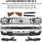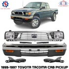 Hype_Turbo Free Shipping & Returns 3-4 days Shipping 30 Days Money Back 100% Satisfaction Front Bumper Chrome Steel & Headlight Assembly Kit For 1995-1997 Toyota Tacoma REPLACEMENT BUMPER KIT Manufactured from top quality components, this is your best option and inexpensive replacement for your rebuild, repair, and maintenance needs - an OE replacement product for your damaged or aged factory part. Replacement - the most affordable brand name for replacement parts that you need! Replacement is a professional brand for autobody, lighting parts, electrical, brake, suspension, intake and exhaust, and cooling and heating products. All Replacement brands include 2-year, unlimited-mileage warranty. NOTES Location : Front & Lower Brand New in the Box - Fit and Quality Guaranteed! Material Plastic, Steel Anticipated Ship Out Time 1-4 business day Quantity Sold Auto Body Repair Kit Set Of 11 Product Fit Direct Fit Replaces OE Number AF703 Color/Finish Black / Chrome Recommended Use OE Replacement Replaces Partslink Number AF703 Vehicle Body Type 2-Door Components [1]Bumper Chrome [1]Grille Assembly Chrome [1]Filler Set of 2 [1]Bumper Bracket Set of 2 [1]Lower Valance [1]Headlight Set Of 2[1] Turn Signal Lights Pair Prop 65 Warning WARNING: This product can expose you to chemical which is known to the State of California to cause cancer and birth defects or other reproductive harm. For more information go to www.P65Warnings.ca.gov. Shipping Notes We have multiple warehouses in US and will choose the nearest one for shipping according to your address and our inventory. Toyota : 1995-1997 Tacoma Base Fleetside, Four Wheel Drive 1995-1997 Tacoma DLX Fleetside, Four Wheel Drive 1995-1997 Tacoma SR5 Extended Cab Pickup, Four Wheel Drive