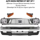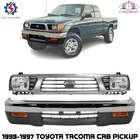 Hype_Turbo Free Shipping & Returns 3-4 days Shipping 30 Days Money Back 100% Satisfaction Front Bumper Grille & Headlight Assembly Kit For 1995-1997 Toyota Tacoma REPLACEMENT BUMPER KIT Manufactured from top quality components, this is your best option and inexpensive replacement for your rebuild, repair, and maintenance needs - an OE replacement product for your damaged or aged factory part. Replacement - the most affordable brand name for replacement parts that you need! Replacement is a professional brand for autobody, lighting parts, electrical, brake, suspension, intake and exhaust, and cooling and heating products. All Replacement brands include 2-year, unlimited-mileage warranty. NOTES Location : Front & Lower Brand New in the Box - Fit and Quality Guaranteed! Material Plastic & Steel Anticipated Ship Out Time 1-4 business day Quantity Sold Auto Body Repair Kit Set Of 7 Product Fit Direct Fit Replaces OE Number AF704 Color/Finish Black / Chrome Recommended Use OE Replacement Replaces Partslink Number AF704 Vehicle Body Type 2-Door Components [1]Bumper Chrome [1]Grille Assembly Chrome [1]Lower Valance [1]Headlight Set Of 2[1] Turn Signal Lights Pair Prop 65 Warning WARNING: This product can expose you to chemical which is known to the State of California to cause cancer and birth defects or other reproductive harm. For more information go to www.P65Warnings.ca.gov. Shipping Notes We have multiple warehouses in US and will choose the nearest one for shipping according to your address and our inventory. Toyota : 1995-1997 Tacoma Base Fleetside, Four Wheel Drive 1995-1997 Tacoma DLX Fleetside, Four Wheel Drive 1995-1997 Tacoma SR5 Extended Cab Pickup, Four Wheel Drive