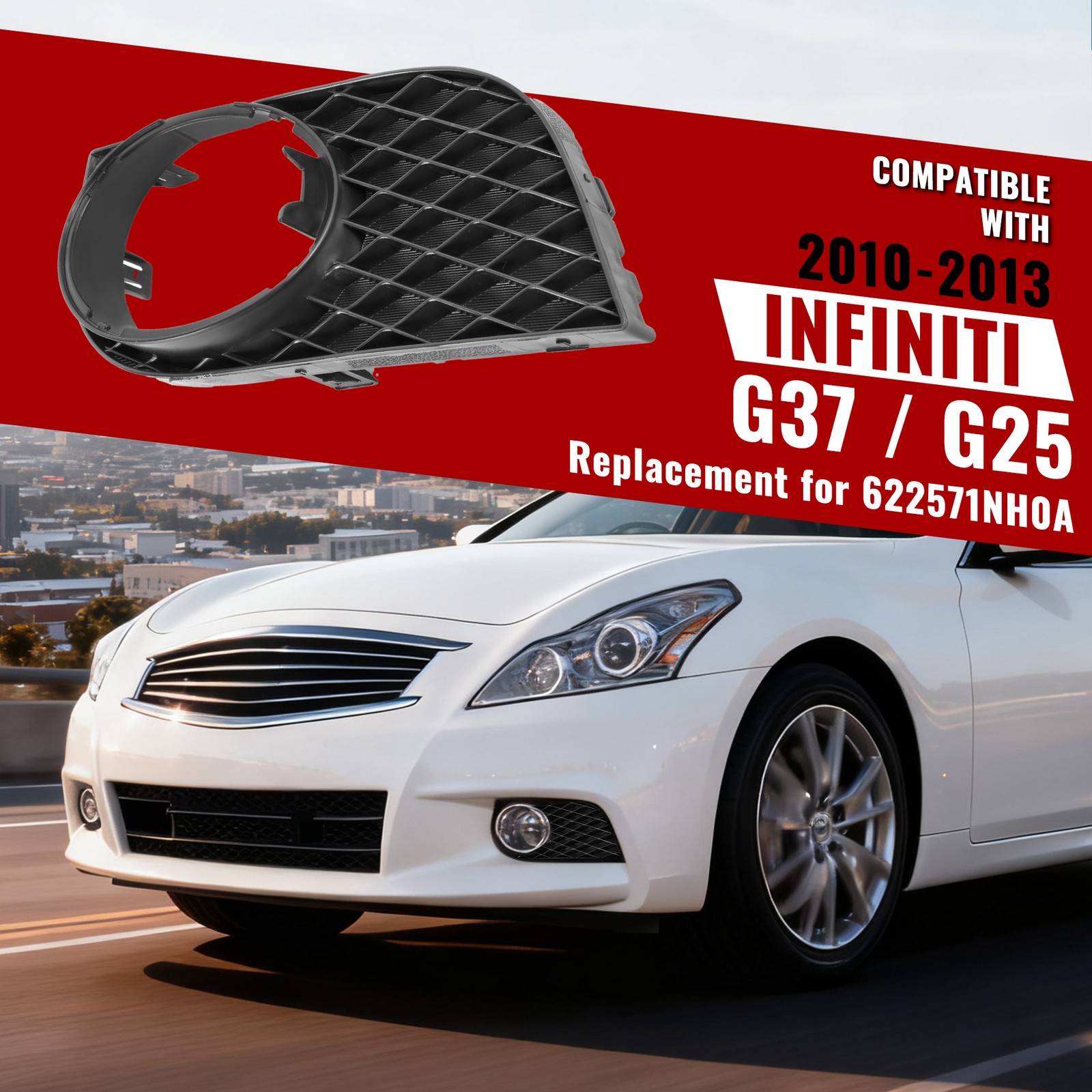 Headlight Assemblies Tail Light Assemblies Fog Light Assemblies Turn Signal Light Assemblies Side Marker Light Assemblies Park & Combination Light Assem Light Bulbs & LEDs Other Type Light Other Product Display Product Description Front Fog Light Bezel For Infiniti G25 G37 10-13 Driver Left Side #622571NX0A FIT FOR: For Infiniti G37 2010-2013 For Infiniti G25 2010-2013 Product Specifics: Type:Fog Light Bezel Placement on Vehicle:Front,Left Installation Method:Replacement Surface Finish:Textured Material:Plastic(PP+GF10%) Replaces Part Number:Replace for 622571NX0A, IN1038114 Features: Cool Design – Modern look upgrades your vehicle style. High-strength PP plastic: lightweight and durable, impact-resistant, high-temperature-resistant, and not easy to age. Strong structure: sturdy material, resistant to flying stones and minor collisions. Package Includes: 1 X Fog Light Bezel(Left Side) Shipping: All items will be shipped out in 1 business day, no expedited service available. We ship our items to USA only(Does NOT include Hawaii, Alaska or Puerto Rico, PO Boxes/APO's). Shipping Notes: We use multiple warehouses and will select the nearest warehouse for delivery according to your order address and our inventory, Thank you for your cooperation. Contact us: Any Questions, Just feel free to contact us on eBay. We will reply you in 24 hours. Brand Story Autolighting—Guiding with Light, Protecting with Craftsmanship. In an era where machinery and technology intertwine, reliability and innovation are the cornerstones of progress. Autolighting was born from a pursuit of unparalleled quality—we are not just a manufacturer of car lights, but also a guardian of safety and convenience. We pay attention to every detail of daily driving. With professionalism and craftsmanship, Autolighting provides solid protection for every journey. On Nov 4, 2025 at 01:13:32 PST, seller added the following information: