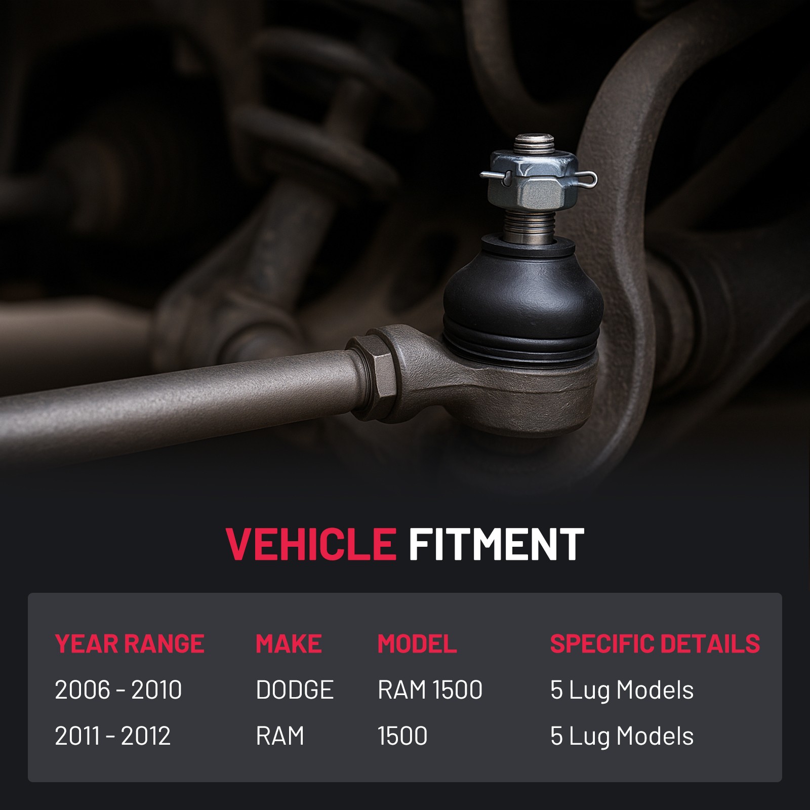 Fitment: 2006 - 2010 Dodge Ram 1500 5 Lug Models 2011 - 2012 Ram 1500 5 Lug Models Description: Replacement OEM ( Original Equipment Part) Number: EV800098:55366383AD, 55366385AD, 68032265AA ES80574:5175790AA, 5175790AB, 5175790AC, 5175790AD, 5175790AE, 5175790AF, 5185890AA Placement on Vehicle: Front, Left, Right, Inner, Outer Package included: 2x Front Inner Tie Rod End - EV800098 2x Front Outer Tie Rod End - ES80574 2x Tie Rod Boots & Bellows w/ Locking C-clamp Fitment: 2006 - 2010 Dodge Ram 1500 5 Lug Models 2011 - 2012 Ram 1500 5 Lug Models Description: Replacement OEM ( Original Equipment Part) Number: EV800098:55366383AD, 55366385AD, 68032265AA ES80574:5175790AA, 5175790AB, 5175790AC, 5175790AD, 5175790AE, 5175790AF, 5185890AA Placement on Vehicle: Front, Left, Right, Inner, Outer Package included: 2x Front Inner Tie Rod End - EV800098 2x Front Outer Tie Rod End - ES80574 2x Tie Rod Boots & Bellows w/ Locking C-clamp