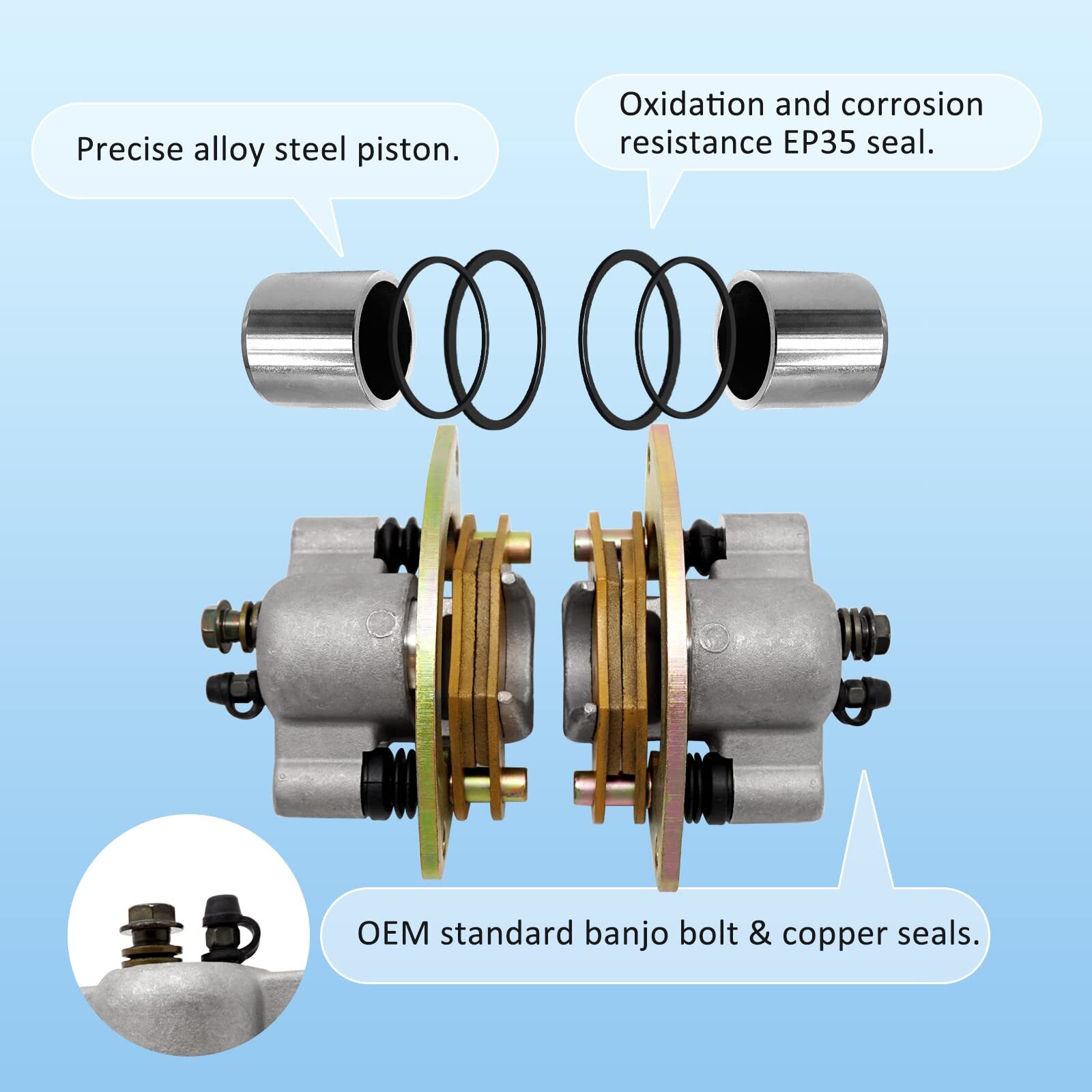 Front Left & Right Brake Caliper Assembly for Polaris Scrambler 850 1000 Manufacturer Part#151 Replacement Part#302 Fitment:Fit for Polaris Scrambler 850 1000 Tractor 1000 XP Sportsman 550/550 EPS 550 Forest 550 Touring 850 XP 850 Tourging 1000 Touring 1000 Touring Tractor Feature: OEM specifications brake caliper assembly with brake pads and exact mounting bracket of American standard thread, directly install, don't need adjustment. Material: Precise alloy piston and anti-ageing seal kit make the caliper have more braking force and longer operation life. Service:If there is any product problem within 1 year, please contact us to solve it for you.We provide product service. Manufacturer Part#151 Replacement Part#302 Package Front right brake caliper ×1 Front left brake caliper×1 Front Left&Rightbrake caliper fit for the following Polaris ATV vehicles: Scrambler 850 2013-2020 Scrambler 1000 Tractor 2016-2019 Scrambler 1000 XP 2014-2018 Sportsman 550/550 EPS 2010-2014 Sportsman 550 Forest 2011-2014 Sportsman 550 Touring 2010-2014 Sportsman 550 X2 2010-2014 Sportsman 550 XP 2009-2010 2013-2014 Sportsman 850 48" 2020 Sportsman 850 Forest 2011-2014 Sportsman 850 MV 2012-2013 Sportsman 850 SP 2015-2019 Sportsman 850 Tourging 2010-2021 Sportsman 850 X2 2011 Sportsman 850 XP 2009-2014 Sportsman 1000 Touring 2015-2018 Sportsman 1000 Touring Tractor 2016-2019 Sportsman 1000 Touring XP 2019-2021 Sportsman 1000 XP 48" 2019-2020 Sportsman 1000 XP Tractor 2016-2019 Shipping We offer FREE shipping on all orders! We ship within Three business days of payment, usually sooner. We use a selection of shipping services such as UPS, FedEx, USPS etc. We only ship to the lower 48 states, no APO/FPO addresses or PO Boxes allowed. Local pickups and combined shipping options are not provided at this time. Return You can return a product for up to 30 days from the date you purchased it. Any product you return must be in the same condition you received it and in the original packaging. Please keep the receipt. Payment We accept payment by any of the following methods: PayPal Please pay as soon as possible after winning an auction, as that will allow us to post your item to you sooner! Feedback Customer satisfaction is very important to us. If you have any problem with your order, please contact us and we will do our best to make you satisfied. Contact Us If you have any queries, please contact us via ebay. We usually respond within 24 hours on weekdays. Please visit our eBay store to check out other items for sale! Thank you for shopping at our store.