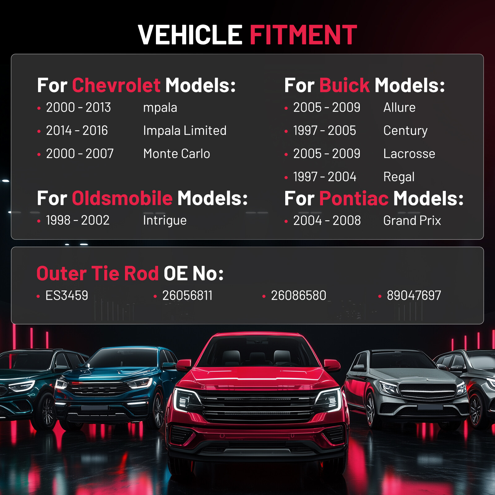 Fits the following Vehicles: Fits for Buick Allure 2005-2009 All Models Fits for Buick Century 1997-2005 All Models Fits for Buick Lacrosse 2005-2009 All Models Fits for Buick Regal 1997-2004 All Models Fits for Chevrolet Impala 2000-2005 All Models Fits for Chevrolet Impala 2006-2009 No SS Fits for Chevrolet Impala 2010-2013 All Models Fits for Chevrolet Impala Limited 2014-2016 Without Rpo Code Fe4 (Special Ride & Handling Suspension) Fits for Chevrolet Monte Carlo 2000-2005 All Models Fits for Chevrolet Monte Carlo 2006-2007 No SS Fits for Oldsmobile Intrigue 1998-2002 All Models Fits for Pontiac Grand Prix 2004-2008 All Models Part Number: ES3459 Package included: 2x Front Outer Tie Rod End Links - ES3459 Fits the following Vehicles: Fits for Buick Allure 2005-2009 All Models Fits for Buick Century 1997-2005 All Models Fits for Buick Lacrosse 2005-2009 All Models Fits for Buick Regal 1997-2004 All Models Fits for Chevrolet Impala 2000-2005 All Models Fits for Chevrolet Impala 2006-2009 No SS Fits for Chevrolet Impala 2010-2013 All Models Fits for Chevrolet Impala Limited 2014-2016 Without Rpo Code Fe4 (Special Ride & Handling Suspension) Fits for Chevrolet Monte Carlo 2000-2005 All Models Fits for Chevrolet Monte Carlo 2006-2007 No SS Fits for Oldsmobile Intrigue 1998-2002 All Models Fits for Pontiac Grand Prix 2004-2008 All Models Part Number: ES3459 Package included: 2x Front Outer Tie Rod End Links - ES3459