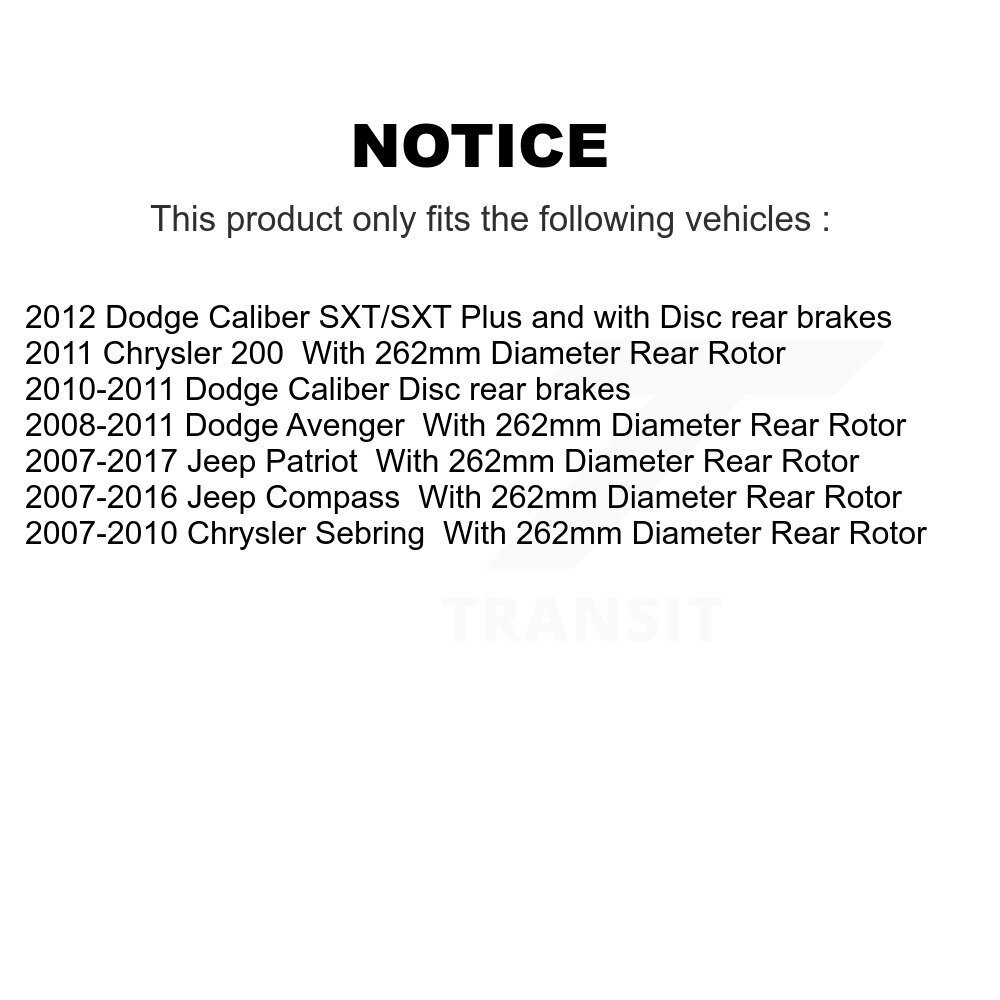 eBay Listing Template Search Required Parts View Our Feedback Contact Us Front Rear Brake Caliper Rotor & Ceramic Pad Kit (10Pc) For Jeep Patriot Compass Product Description Description: Brand: Transit Auto Warranty: 1 Year Part Type: Disc Rotors and Brake Pads Kit Placement on Vehicle: Front and Rear CMX new calipers are manufactured to exacting OE standards to ensure a perfect performance for the life of the vehicle Engineered with carbon-enhanced XCast (G3000) iron castings to achieve an optimal wear resistance, tensile strength and steel hardness providing unmatched braking performance Industrial grade ZincShield caliper coating provides an unmatched protection against Rust, Moisture and Oxidation 1:1 OE Design - Chamfered and slotted only when applicable to ensure safety and perfect fit Item specifics: Includes (10 pcs): 2x Front Disc Brake Caliper (Both Side) 2x Rear Disc Brake Caliper (Both Side) 2x Front Disc Brake Rotor (Both Side) 2x Rear Disc Brake Rotor (Both Side) 1x Front Ceramic Brake Pad Set (Hardware Included) 1x Rear Ceramic Brake Pad Set (Hardware Included) Interchange Part Numbers: 18A5032; SLB2090; 2C-5032; 18-P5032; 18-B5032; BC63078; SC0207-1; C63078; 2626XA; 99-17728A; 11-22165A-1; FRC11953N; FRC11953C; FRC11953; CN4304; 18A5033; SLB2091; 2C-5033; 18-P5033; 18-B5033; BC63077; SC0208-1; C63077; 2626XB; 99-17728B; 11-22166A-1; FRC11954N; FRC11954C; FRC11954; CN4305; 18A5039; SLB2064; 2C-5039; 18-P5039; 18-B5039; BC63534; SC0209; C63534; 2633XB; 99-17729B; 10-03209-1; FRC11962N; FRC11962C; FRC11962; CN1715; 18A5038; SLB2065; 2C-5038; 18-P5038; 18-B5038; BC63533; SC0210; C63533; 2633XA; 99-17729A; 10-03210-1; FRC11961N; FRC11961C; FRC11961; CN1716; AC53038; AG53038; CR53038; PR53038; 53038; YH145706C; YH145706; 120.63067; 121.63067; SEE; BR31346; 53235; 248880459; 48880459; 748880459; SEE; 126335; Q53038; 780459; 981036; BD126509; AC53036; AG53036; CR53036; PR53036; 53036; YH145672C; YH145672; 120.63066; 121.63066; BR900334; BR900600; 53236; 248880457; 48880457; 748880457; 900334; Q53036; 780457; BD126539; PTC2057; PTC866; 866A; D866A; 7741; 8338; 8402; 9290; AD7741; AD9290; PF7741M; PF7741X; PF9290X; QE7741X; SG7741X; SS7741X; SS9290X; D1285; D2057; D866; 1285; 2057; 866; PRC1037; 7940; AD7940; PF7940X; QE7940X; SG7940X; SS7940X; D1037; 1037 Confirm Your Vehicle Compatibility Year Make Model Application Notes 2011 Chrysler 200 With 262mm Diameter Rear Rotor; Position: Front and Rear; 2007 Chrysler Sebring With 262mm Diameter Rear Rotor; Position: Front and Rear; 2008 Chrysler Sebring With 262mm Diameter Rear Rotor; Position: Front and Rear; 2009 Chrysler Sebring With 262mm Diameter Rear Rotor; Position: Front and Rear; 2010 Chrysler Sebring With 262mm Diameter Rear Rotor; Position: Front and Rear; 2008 Dodge Avenger With 262mm Diameter Rear Rotor; Position: Front and Rear; 2009 Dodge Avenger With 262mm Diameter Rear Rotor; Position: Front and Rear; 2010 Dodge Avenger With 262mm Diameter Rear Rotor; Position: Front and Rear; 2011 Dodge Avenger With 262mm Diameter Rear Rotor; Position: Front and Rear; 2010 Dodge Caliber Rear Disc Brakes; Position: Front and Rear; 2011 Dodge Caliber Rear Disc Brakes; Position: Front and Rear; 2012 Dodge Caliber Submodel: SXT Plus;Rear Disc Brakes; Position: Front and Rear; 2012 Dodge Caliber Submodel: SXT;Rear Disc Brakes; Position: Front and Rear; 2007 Jeep Compass With 262mm Diameter Rear Rotor; Position: Front and Rear; 2008 Jeep Compass With 262mm Diameter Rear Rotor; Position: Front and Rear; 2009 Jeep Compass With 262mm Diameter Rear Rotor; Position: Front and Rear; 2010 Jeep Compass With 262mm Diameter Rear Rotor; Position: Front and Rear; 2011 Jeep Compass With 262mm Diameter Rear Rotor; Position: Front and Rear; 2012 Jeep Compass With 262mm Diameter Rear Rotor; Position: Front and Rear; 2013 Jeep Compass With 262mm Diameter Rear Rotor; Position: Front and Rear; 2014 Jeep Compass With 262mm Diameter Rear Rotor; Position: Front and Rear; 2015 Jeep Compass With 262mm Diameter Rear Rotor; Position: Front and Rear; 2016 Jeep Compass With 262mm Diameter Rear Rotor; Position: Front and Rear; 2007 Jeep Patriot With 262mm Diameter Rear Rotor; Position: Front and Rear; 2008 Jeep Patriot With 262mm Diameter Rear Rotor; Position: Front and Rear; 2009 Jeep Patriot With 262mm Diameter Rear Rotor; Position: Front and Rear; 2010 Jeep Patriot With 262mm Diameter Rear Rotor; Position: Front and Rear; 2011 Jeep Patriot With 262mm Diameter Rear Rotor; Position: Front and Rear; 2012 Jeep Patriot With 262mm Diameter Rear Rotor; Position: Front and Rear; 2013 Jeep Patriot With 262mm Diameter Rear Rotor; Position: Front and Rear; 2014 Jeep Patriot With 262mm Diameter Rear Rotor; Position: Front and Rear; 2015 Jeep Patriot With 262mm Diameter Rear Rotor; Position: Front and Rear; 2016 Jeep Patriot With 262mm Diameter Rear Rotor; Position: Front and Rear; 2017 Jeep Patriot With 262mm Diameter Rear Rotor; Position: Front and Rear; To confirm that this part fits your vehicle, enter your vehicle's Year, Make, Model, Trim and Engine in the eBay Compatibility Table. Also review the notes section in the compatibility chart for additional specifications about this part. Contact DT Auto Parts If you have any questions, you may reach us via our eBay Contact Form . Shipping & Handling Shipping Service: Please refer to shipping section Shipping Cost: Please refer to shipping section Order Processing Time: 1 Days Returns Return shipping paid by: Seller Item must be returned within: 30 Days Refund will be given as: MoneyBack About Us We are a small family business of auto parts and auto parts accessories. Our mission is to provide quality products, best customer care, and fast shipping. Whether you are doing maintenance, a long-term automotive project, or just trying to get your vehicle running, count on DTautoparts to help you with your small or big project. California Proposition 65 WARNING: This product may contain chemicals known to the State of California to ca