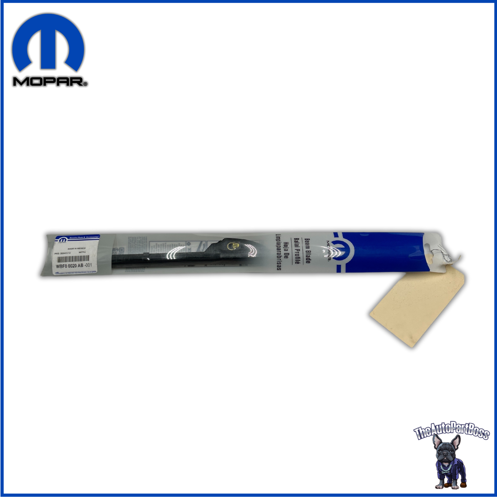 Message Us BRAND NEW MOPAR GENUINE ORDERS ARE SHIPPED SAME DAY IF PLACED BEFORE 5 PM EST If Express or Expedited shipping is not available, please contact us. GENUINE MOPAR PART # WBF00020AB Front Wiper Blade Key Features: Quality and Fit OEM Standards 100% Genuine Part Ready to Order? Don't miss out on this high-quality, genuine part. Order now and enjoy fast shipping! If you are not sure this will fit your vehicle, please message us your VIN before ordering to verify compatibility. FOR: Year Make Model Body & Trim Engine & Transmission 2019 Chrysler Pacifica Hybrid Limited, Hybrid Touring L, Hybrid Touring Plus, L, LX, Limited, Touring, Touring L, Touring L Plus, Touring Plus 3.6L V6 - Electric/Gas, 3.6L V6 - Flex, 3.6L V6 - Gas 2019 Dodge Grand Caravan GT, SE, SXT 3.6L V6 - Flex, 3.6L V6 - Gas 2018 Chrysler Pacifica Hybrid Limited, Hybrid Touring L, Hybrid Touring Plus, L, LX, Limited, Touring, Touring L, Touring L Plus, Touring Plus 3.6L V6 - Electric/Gas, 3.6L V6 - Flex, 3.6L V6 - Gas 2018 Dodge Grand Caravan GT, SE, SE Plus, SXT 3.6L V6 - Flex, 3.6L V6 - Gas 2018 Jeep Renegade Altitude, Latitude, Limited, Sport, Trailhawk 1.4L L4 - Gas, 2.4L L4 - Flex, 2.4L L4 - Gas 2017 Chrysler Pacifica Hybrid Platinum, Hybrid Premium, LX, Limited, Touring, Touring L, Touring L Plus 3.6L V6 - Electric/Gas, 3.6L V6 - Flex, 3.6L V6 - Gas 2017 Dodge Grand Caravan GT, SE, SE Plus, SXT 3.6L V6 - Flex, 3.6L V6 - Gas 2017 Jeep Compass Latitude, Sport 2.0L L4 - Gas, 2.4L L4 - Gas 2017 Jeep Patriot Latitude, Sport 2.0L L4 - Gas, 2.4L L4 - Gas 2016 Chrysler Town & Country LX, Limited, Limited Platinum, S, Touring, Touring L 3.6L V6 - Flex, 3.6L V6 - Gas 2016 Dodge Grand Caravan American Value Package, R/T, SE, SE Plus, SXT 3.6L V6 - Flex, 3.6L V6 - Gas 2016 Jeep Compass 75th Anniversary, Latitude, Sport 2.0L L4 - Gas, 2.4L L4 - Gas 2016 Jeep Patriot 75th Anniversary, Latitude, Sport 2.0L L4 - Gas, 2.4L L4 - Gas 2015 Chrysler Town & Country LX, Limited, Limited Platinum, S, Touring, Touring L 3.6L V6 - Flex, 3.6L V6 - Gas 2015 Dodge Grand Caravan American Value Package, R/T, SE, SXT 3.6L V6 - Flex, 3.6L V6 - Gas 2015 Jeep Compass Altitude, High Altitude, Latitude, Limited, Sport 2.0L L4 - Gas, 2.4L L4 - Gas 2015 Jeep Patriot Latitude, Limited, Sport 2.0L L4 - Gas, 2.4L L4 - Gas 2015 Ram C/V Tradesman 3.6L V6 - Flex 2014 Chrysler Town & Country 30th Anniversary Edition, Limited, S, Touring, Touring L 3.6L V6 - Flex, 3.6L V6 - Gas 2014 Dodge Grand Caravan American Value Package, R/T, SE, SE 30th Anniversary Edition, SXT, SXT 30th Anniversary Edition 3.6L V6 - Flex, 3.6L V6 - Gas 2014 Jeep Compass Latitude, Limited, Sport 2.0L L4 - Gas, 2.4L L4 - Gas 2014 Jeep Patriot Latitude, Limited, Sport 2.0L L4 - Gas, 2.4L L4 - Gas 2014 Ram C/V Base 3.6L V6 - Flex 2013 Chrysler Town & Country Limited, S, Touring, Touring L 3.6L V6 - Flex, 3.6L V6 - Gas 2013 Dodge Grand Caravan Crew, R/T, SE, SXT 3.6L V6 - Flex, 3.6L V6 - Gas 2013 Jeep Compass Latitude, Limited, Sport 2.0L L4 - Gas, 2.4L L4 - Gas 2013 Jeep Patriot Latitude, Limited, Sport 2.0L L4 - Gas, 2.4L L4 - Gas 2013 Ram C/V Base 3.6L V6 - Flex 2012 Chrysler Town & Country Limited, Touring, Touring L 3.6L V6 - Flex, 3.6L V6 - Gas 2012 Dodge Grand Caravan Crew, R/T, SE, SXT 3.6L V6 - Flex, 3.6L V6 - Gas 2012 Jeep Compass Latitude, Limited, Sport 2.0L L4 - Gas, 2.4L L4 - Gas 2012 Jeep Patriot Latitude, Limited, Sport 2.0L L4 - Gas, 2.4L L4 - Gas 2012 Ram C/V Base 3.6L V6 - Flex 2011 Chrysler Town & Country Limited, Touring, Touring L 3.6L V6 - Flex, 3.6L V6 - Gas 2011 Dodge Grand Caravan C/V, Crew, Express, Mainstreet, R/T 3.6L V6 - Flex, 3.6L V6 - Gas 2011 Jeep Compass Base, Latitude, Limited 2.0L L4 - Gas, 2.4L L4 - Gas 2011 Jeep Patriot Latitude, Latitude X, Sport 2.0L L4 - Gas, 2.4L L4 - Gas 2010 Chrysler PT Cruiser Classic 2.4L L4 - Gas 2010 Chrysler Town & Country LX, Limited, Touring, Touring Plus, Walter P. Chrysler Signature Series 3.3L V6 - Flex, 3.8L V6 - Gas, 4.0L V6 - Gas 2010 Dodge Grand Caravan C/V, SE, SXT 3.3L V6 - Flex, 3.8L V6 - Gas, 4.0L V6 - Gas 2010 Jeep Compass Limited, Sport 2.0L L4 - Gas, 2.4L L4 - Gas 2010 Jeep Patriot Limited, Sport 2.0L L4 - Gas, 2.4L L4 - Gas 2009 Chrysler PT Cruiser LX, Limited, Touring 2.4L L4 - Gas 2009 Chrysler Town & Country LX, Limited, Touring 3.3L V6 - Flex, 3.8L V6 - Gas, 4.0L V6 - Gas 2009 Dodge Grand Caravan C/V, SE, SXT 3.3L V6 - Flex, 3.8L V6 - Gas, 4.0L V6 - Gas 2009 Jeep Compass Limited, Sport 2.0L L4 - Gas, 2.4L L4 - Gas 2009 Jeep Patriot Limited, Sport 2.0L L4 - Gas, 2.4L L4 - Gas 2008 Chrysler Crossfire Limited 3.2L V6 - Gas 2008 Chrysler PT Cruiser Base, LX, Limited, Touring 2.4L L4 - Gas 2008 Chrysler Town & Country LX, Limited, Touring 3.3L V6 - Flex, 3.3L V6 - Gas, 3.8L V6 - Gas, 4.0L V6 - Gas 2008 Dodge Grand Caravan C/V, SE, SXT 3.3L V6 - Flex, 3.3L V6 - Gas, 3.8L V6 - Gas, 4.0L V6 - Gas 2008 Jeep Compass Limited, Sport 2.0L L4 - Gas, 2.4L L4 - Gas 2008 Jeep Patriot Limited, Sport 2.0L L4 - Gas, 2.4L L4 - Gas 2007 Chrysler Crossfire Base, Limited 3.2L V6 - Gas 2007 Chrysler PT Cruiser Base, GT, Limited, Touring 2.4L L4 - Gas 2007 Jeep Compass Limited, Sport 2.0L L4 - Gas, 2.4L L4 - Gas 2007 Jeep Patriot Limited, Sport 2.0L L4 - Gas, 2.4L L4 - Gas 2006 Chrysler Crossfire Base, Limited, SRT-6 3.2L V6 - Gas 2006 Chrysler PT Cruiser Base, GT, Limited, Touring 2.4L L4 - Gas 2005 Chrysler Crossfire Base, Limited, SRT-6 3.2L V6 - Gas 2005 Chrysler PT Cruiser Base, GT, Limited, Touring 2.4L L4 - Gas 2004 Chrysler Crossfire Base 3.2L V6 - Gas 2004 Chrysler PT Cruiser Base, GT, Limited, Touring 2.4L L4 - Gas 2003 Chrysler PT Cruiser Base, GT, Limited, Touring 2.4L L4 - Gas 2002 Chrysler PT Cruiser Base, Limited, Touring 2.4L L4 - Gas 2001 Chrysler PT Cruiser Base 2.4L L4 - Gas