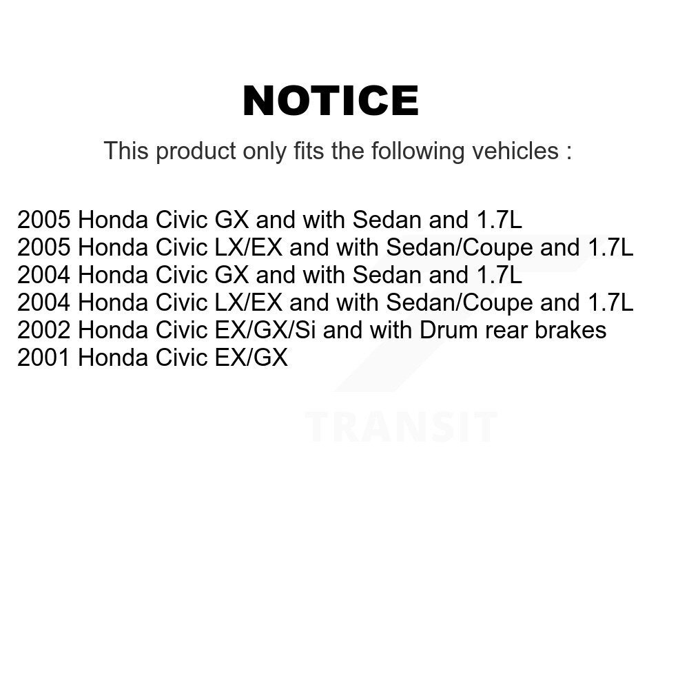 eBay Listing Template Search Required Parts View Our Feedback Contact Us Front Rear Disc Brake Caliper Rotor Drum Semi-Metallic Pad Shoe Cylinder Kit For Product Description Description: Brand: Transit Auto Warranty: 1 Year Part Type: Disc Rotors and Brake Pads Kit Placement on Vehicle: Front and Rear CMX new calipers are manufactured to exacting OE standards to ensure a perfect performance for the life of the vehicle TQ OE-matched friction material gives our brake shoe the ideal balance between tensile and hardness and provide consistent wear, long life, and quiet operation TQ OE-matched material gives our spring kit the ideal balance between tensile and hardness and provide consistent wear, long life, and quiet operation High density friction material to ensure a long pad life and excellent stopping power Item specifics: Includes (11 pcs): 2x Front Disc Brake Caliper (Both Side) 2x Front Disc Brake Rotor (Both Side) 1x Front Semi-Metallic Brake Pad Set (Hardware Included) 2x Rear Brake Drum (Both Side) 1x Rear Drum Brake Shoe Set 2x Rear Drum Brake Wheel Cylinder (Both Side) 1x Rear Drum Brake Hardware Kit Interchange Part Numbers: 19A1833; SLB19726; 2C-1833; 19-P1833; 19-B1833; BC40085; SC1820; C40085; 1562XB; 99-00929B; 10-05248-1; FRC10694N; FRC10694C; FRC10694; CN2204; 19A1832; SLB19727; 2C-1832; 19-P1832; 19-B1832; BC40086; SC1819; C40086; 1562XA; 99-00929A; 10-05247-1; FRC10693N; FRC10693C; FRC10693; CN2203; AC3295; AG3295; CR3295; PR3295; 3295; YH141471C; YH141471; 120.40021; 121.40021; BR3295; HO-556; 24886087; 4886087; 74886087; 61982; Q3295; 96087; AHO1003; BD61982; 7632; 7573; SG7573X; PF7573X; AD7573; QE7573X; SS7573X; UP7573X; D465A; 465A; AG35094; CD35094; PD35094; 35094; YH140746C; YH140746; 122.40014; 123.40014; BD35094; BD920140; HOD-56; 4401780; 125769; Q35094; 9724; BD125769; 576; NB576; 576B; 34215; 34268; 34278; WC250290; WC370132; WC370152; WC139975; 34232; 34277; WC250300; W610032; WC370131; WC370149; WC139976; 17351K; 17351; HW17351; H17352 Confirm Your Vehicle Compatibility Year Make Model Application Notes 2001 Honda Civic Submodel: EX; Position: Front and Rear; 2001 Honda Civic Submodel: GX; Position: Front and Rear; 2002 Honda Civic Submodel: EX;Rear Drum Brakes; Position: Front and Rear; 2002 Honda Civic Submodel: GX;Rear Drum Brakes; Position: Front and Rear; 2002 Honda Civic Submodel: Si;Rear Drum Brakes; Position: Front and Rear; 2004 Honda Civic Submodel: EX Coupe; Engine: 1.7L L4; Position: Front and Rear; 2004 Honda Civic Submodel: EX Sedan; Engine: 1.7L L4; Position: Front and Rear; 2004 Honda Civic Submodel: GX Sedan; Engine: 1.7L L4; Position: Front and Rear; 2004 Honda Civic Submodel: LX Coupe; Engine: 1.7L L4; Position: Front and Rear; 2004 Honda Civic Submodel: LX Sedan; Engine: 1.7L L4; Position: Front and Rear; 2005 Honda Civic Submodel: EX Coupe; Engine: 1.7L L4; Position: Front and Rear; 2005 Honda Civic Submodel: EX Sedan; Engine: 1.7L L4; Position: Front and Rear; 2005 Honda Civic Submodel: GX Sedan; Engine: 1.7L L4; Position: Front and Rear; 2005 Honda Civic Submodel: LX Coupe; Engine: 1.7L L4; Position: Front and Rear; 2005 Honda Civic Submodel: LX Sedan; Engine: 1.7L L4; Position: Front and Rear; To confirm that this part fits your vehicle, enter your vehicle's Year, Make, Model, Trim and Engine in the eBay Compatibility Table. Also review the notes section in the compatibility chart for additional specifications about this part. Contact DT Auto Parts If you have any questions, you may reach us via our eBay Contact Form . Shipping & Handling Shipping Service: Please refer to shipping section Shipping Cost: Please refer to shipping section Order Processing Time: 1 Days Returns Return shipping paid by: Seller Item must be returned within: 30 Days Refund will be given as: MoneyBack About Us We are a small family business of auto parts and auto parts accessories. Our mission is to provide quality products, best customer care, and fast shipping. Whether you are doing maintenance, a long-term automotive project, or just trying to get your vehicle running, count on DTautoparts to help you with your small or big project. California Proposition 65 WARNING: This product may contain chemicals known to the State of California to cause cancer and birth defects or other reproductive harm. For more info go to www.p65warnings.ca.gov 2024 DT Auto Parts Inc. All Rights Reserved.