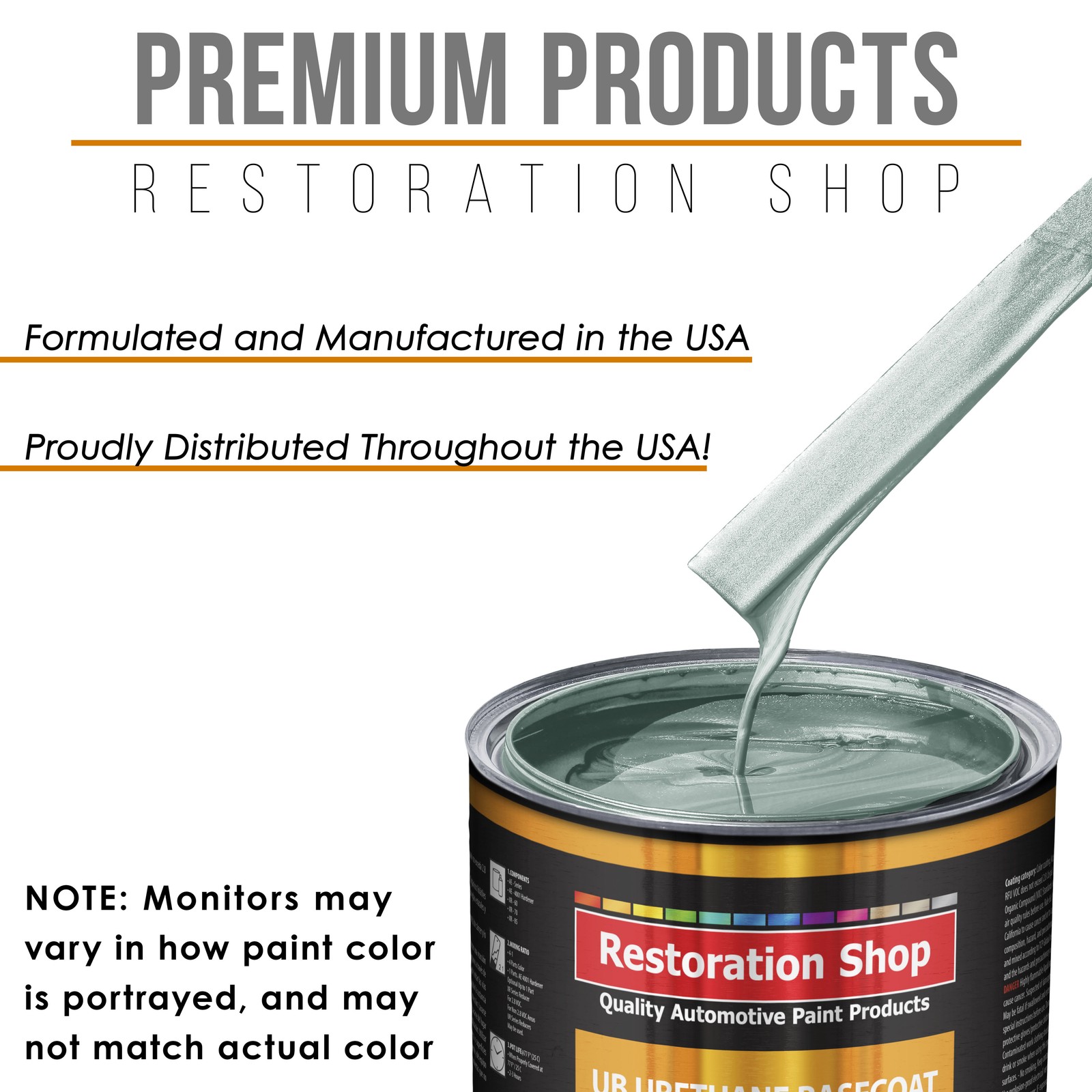 TCP Global Ebay Storefront Ordering | Shipping | Returns | International Product Information FLAMMABLE/HAZARDOUS ITEMS ARE SHIPPED VIA UPS GROUND/STANDARD TO THE LOWER 48 U.S. STATES & CANADA. ***SHIPPING VIA U.S. POSTAL SERVICE OR TO A P.O. BOX IS NOT AVAILABLE.*** RUSH AIR SHIPPING IS AVAILABLE IN CONTINENTAL U.S. FOR AN ADDITIONAL HAZMAT AIR SHIPPING CHARGE. CONTACT US PRIOR TO ORDERING FOR AIR SHIPPING QUOTE. IF ORDER IS PLACE FOR AIR SHIPPING YOU WILL BE CONTACTED FOR ADDITIONAL SHIPPING PAYMENT. INTERNATIONAL SHIPPING IS AVAILABLE. CONTACT US FOR SHIPPING QUOTE PRIOR TO ORDERING. Part# RSP UB2601-KIT-Q Frost Green Metallic - Urethane Basecoat with Clearcoat Auto Paint - Complete Medium Quart Paint Kit - Professional Gloss Automotive Car Truck Coating Complete 1 Quart Restoration Shop Urethane Basecoat with Clearcoat Auto Paint Kit with Medium Drying Reducer (Used when the ambient temperature range is 70-85Á F). The kit provides 1-1/2 Quarts of sprayable basecoat color material and 1-1/4 Quarts of Premium Clearcoat. UB Paint Kit includes 1 Quart of UB Urethane Basecoat Paint Color, 1 Quart of UR70 Medium Urethane Reducer, 1 Quart of RC4221 High-Gloss Urethane Clear, 1 Half-Pint of RH4201 Urethane Hardener and a 3 Pack of 190 Micron Nylon Automotive Strainers and a 5 Pack of Wood Paint Mixing Sticks. The Restoration Shop (UB) Urethane Basecoat and Premium Clearcoat System is a State-of-the-Art High-Performance Professional Easy-To-Use Paint Coating System that is Designed to Reproduce the Hi-Tech O.E.M. Automotive Finishes Found on Today's Vehicles. UB is an easy to spray fast-drying basecoat/clearcoat system that provides a long-lasting and very high gloss topcoat finish result. UB is an extremely durable, chemical and solvent resistant coating that also resists chipping, cracking, and UV ray fading. NOTE: Kit Not Available for Purchase in California or Other States with VOC limits below 3.5 VOC. Restoration Shop's (UBLV) is a Low 3.5 VOC compliant basecoat/clearcoat paint system that is available for purchase in 3.5 VOC limit States. Check your local air quality control district for more information on VOC rules and regulations in your area before purchasing. Note: Monitors vary - onscreen colors are for general color reference only. CALIFORNIA RESIDENTS: This item is not compliant for purchase in the State of California. If your shipping address is a California address you CANNOT purchase this item. Your order will be cancelled, NO EXCEPTIONS . California residents must purchase our UBLV LOW VOC Compliant Paint. Restoration Shop (UB) URETHANE BASECOAT with CLEARCOAT - COMPLETE MEDIUM QUART PAINT KIT Includes: 1 - Quart of High-Performance Restoration Shop Urethane Basecoat Auto Paint Color 1 - Quart of Medium (70-85¡ F) Urethane Reducer (RSP UR70-QT) 1 - Quart of High-Gloss Urethane Clear (RSP RC4221-QT) 1 - Half-Pint of Urethane Hardener (RSP RH4201-HP) 3 - Each Premium 190 Micron Nylon Automotive Strainers UB has a 2 to 1 Mixing Ratio, 2 parts UB Paint Color to 1 part Urethane Reducer. UB Basecoat color requires a 2 to 1 mix ratio with the included medium drying (70-85¡ F) urethane reducer before spraying. Restoration Shop High-Gloss Urethane Clear (RSP RC4221) has a 4 to 1 Mix Ratio, 4 parts Urethane Clearcoat to 1 part Urethane Hardener A 2.1 VOC conventional solid polyurethane clearcoat. A two-component (2K) polyurethane clearcoat formulated to offer ease of application, great flow and leveling, excellent durability and high-gloss. This high quality clearcoat is the prefered high production topcoat that professional's use in today's high-end auto body shops. Optional Reducers Available Separately UR Series Urethane Reducers: UR60 Fast Reducer 60-70¡ F; UR70 Medium Reducer 70-85¡ F; UR85 Slow Reducer 85¡ F and above NOTE: Kit Not Available for Purchase in California or the Other States with VOC limits below 3.5 VOC. If your shipping address is California address, you cannot purchase this item, and your order will be canceled, no exceptions. Restoration Shop's (UBLV) is a Low 3.5 VOC compliant basecoat/clearcoat paint system that is available for purchase in 3.5 VOC limit States. Check your local air quality control district for more information on VOC rules and regulations in your area before purchasing. Restoration Shop UB Urethane Basecoat is a state-of-the-art basecoat designed to reproduce the hi-tech O.E.M. finishes found on today's vehicles. It features outstanding coverage, rapid dry time, excellent metallic control and optimum repairability. View all categories Warehouse Locations San Diego, California South Carolina