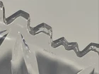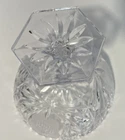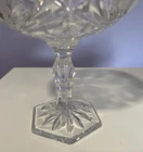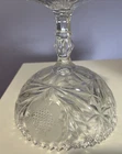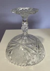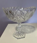 Cut Sawtooth Crystal Glass Compote Frosted Flowers - 6.75” Tall with top diameter of 6.25" This pretty piece has three flowers interspersed with stars on the outside of the bowl and a sawtooth top edge. It would be great holding candy or trinkets or on display alone. It does not appear hand cut but has a pretty crystal ring to it. I see one tiny chip on inside of one sawtooth piece and another on the edge of a corner on the base, see pictures for both. Please review all pictures carefully as they are part of the description. Questions are welcome.