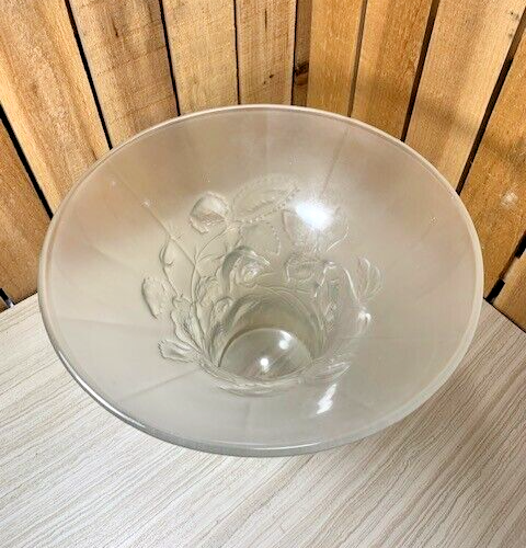 Frosted glass rose bowl or vase with a flared top and raised roses on the outside. Approximately 7" tall, 9 1/4" diameter at the top, 4" diameter at the base and weighs 4 lbs 2 oz. There are a few light scratches from use and white spots that might be from the manufacturing process as seen in the photos. No visible cracks or chips. Please see all photos as they are part of the description. We try to list as many details as possible, however some items are vintage and pre-owned so flaws are to be expected. We try to find out as much information as possible on each item we have available. On occasion we may make a mistake and appreciate your feedback.